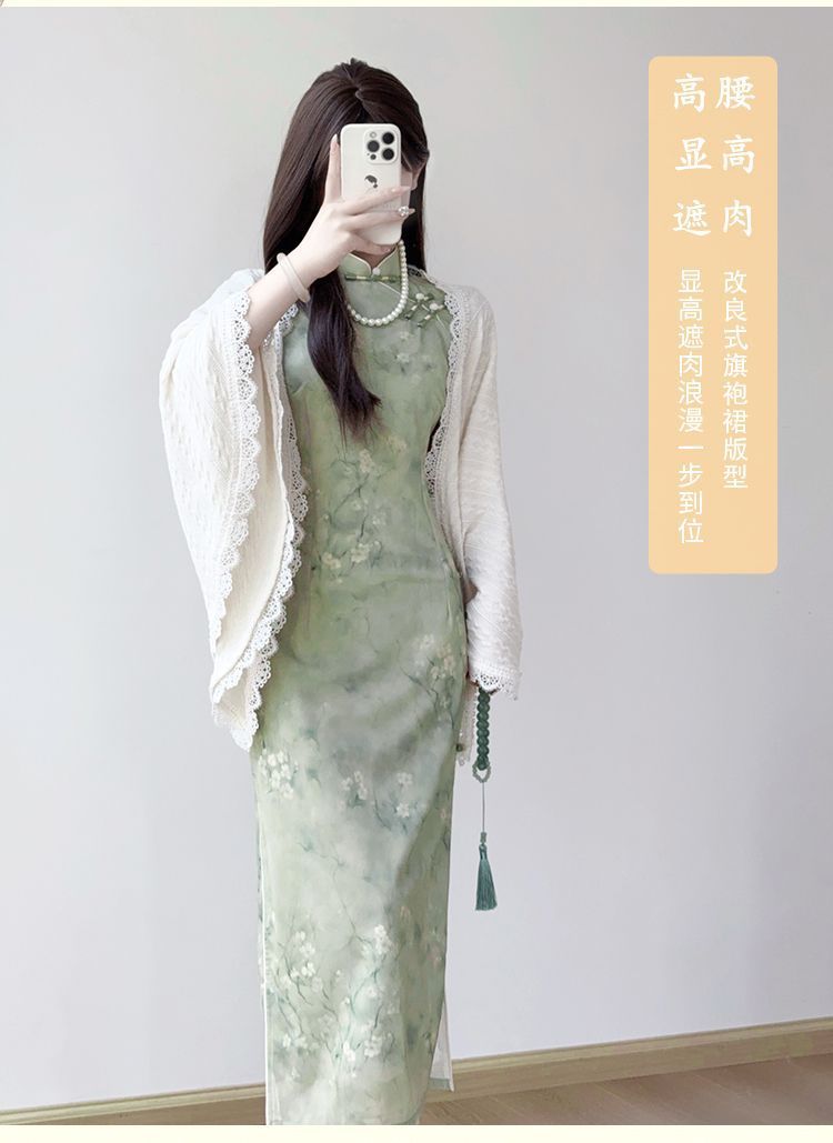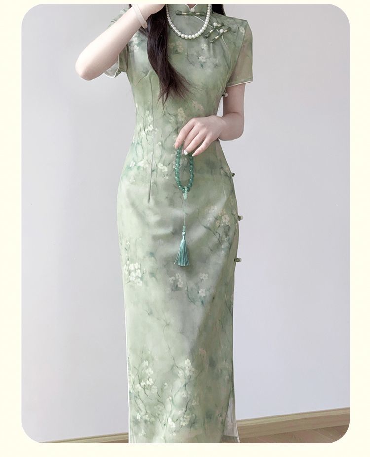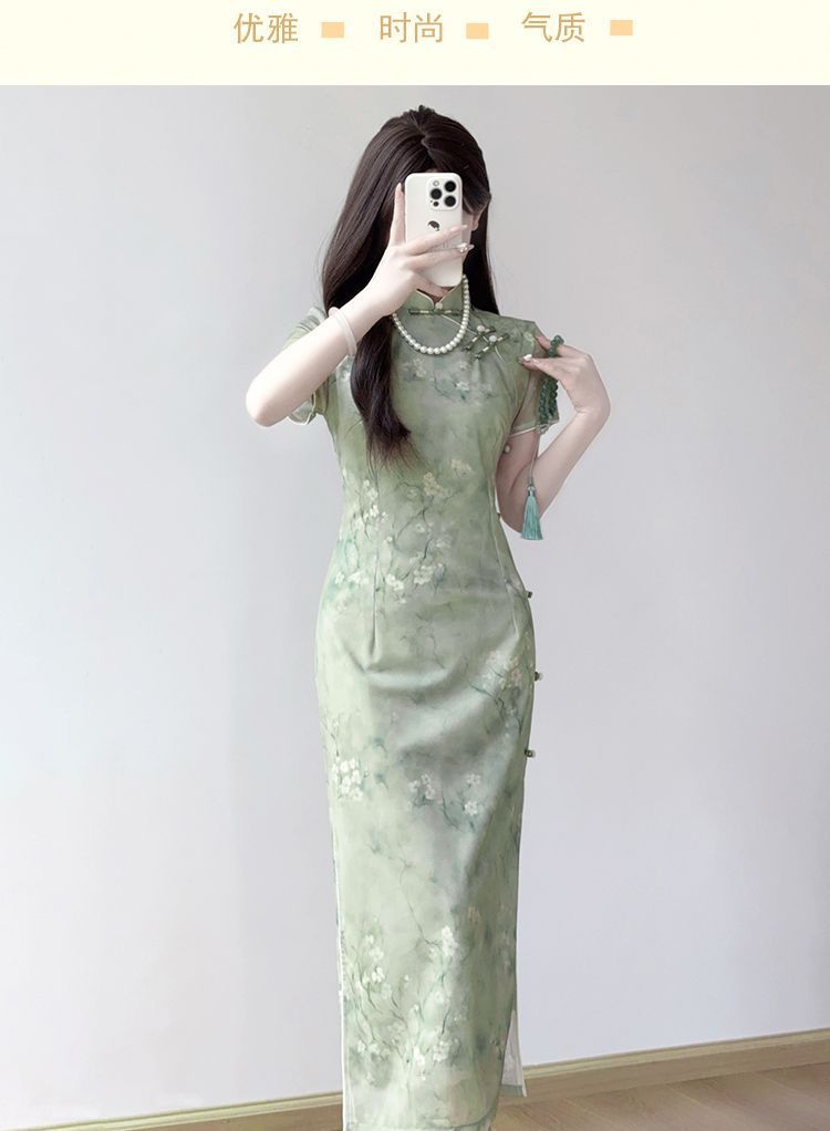 新中国風素雅チャイナドレスは若いタイプの少女の高級感を改良したレトロな緑のプリントのワンピースです。