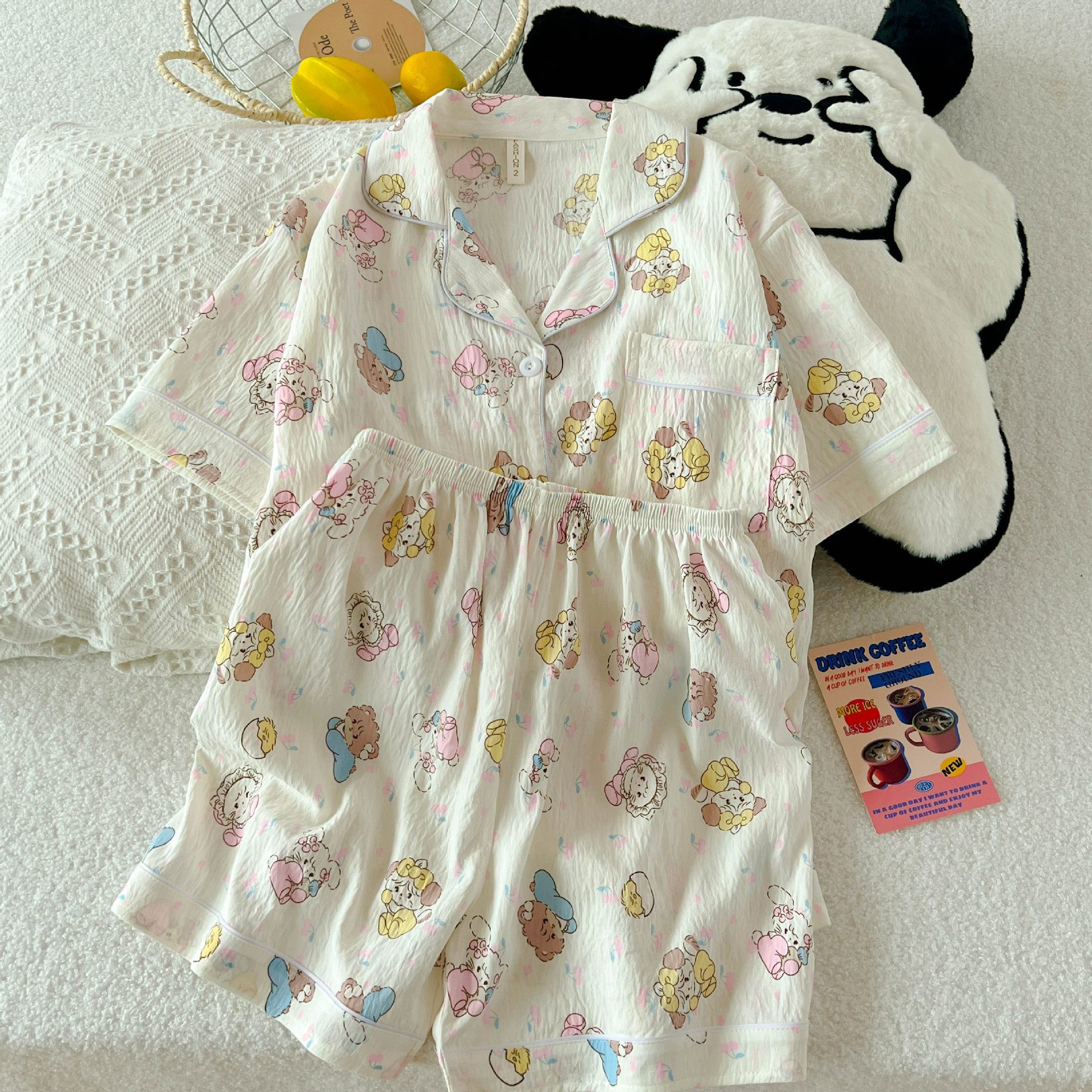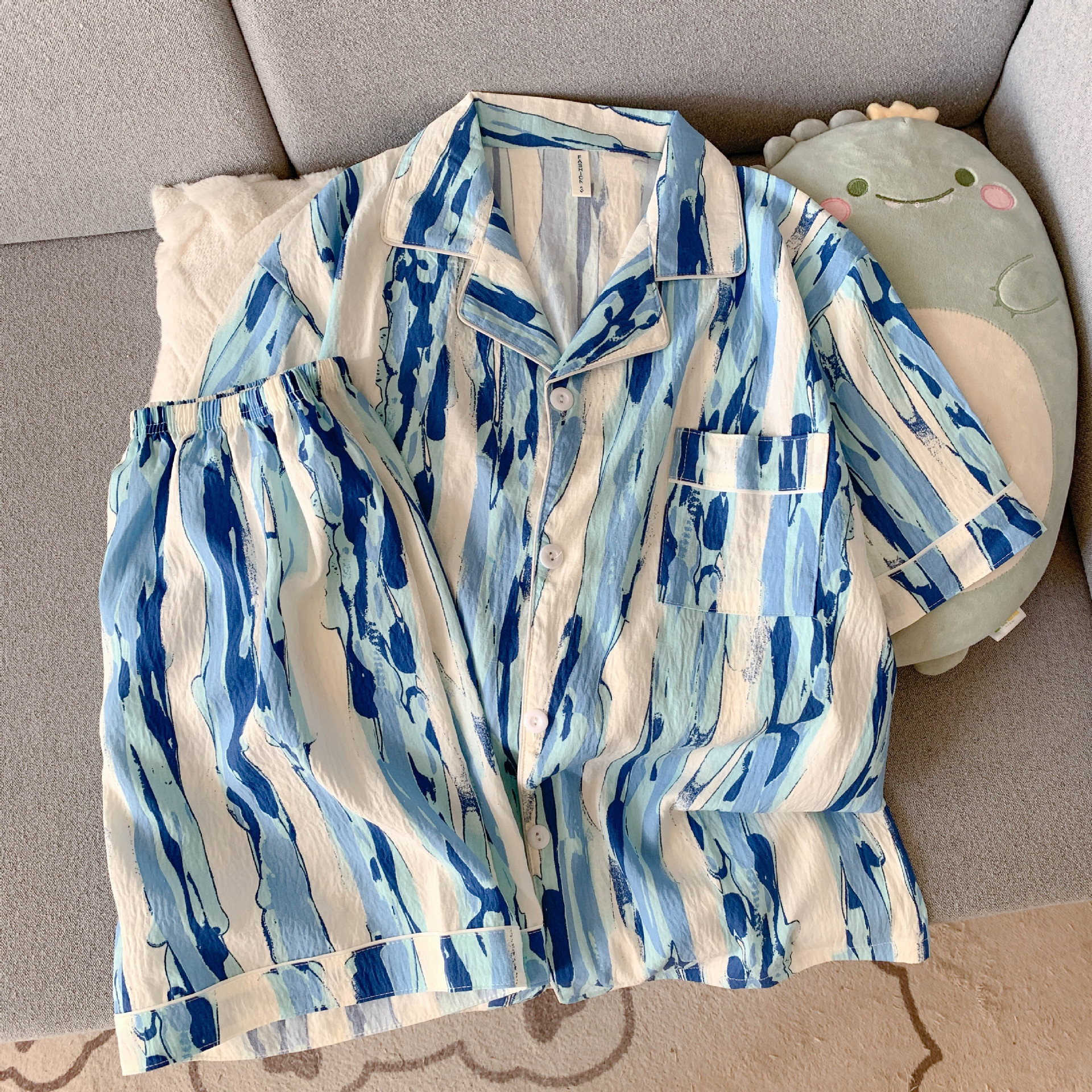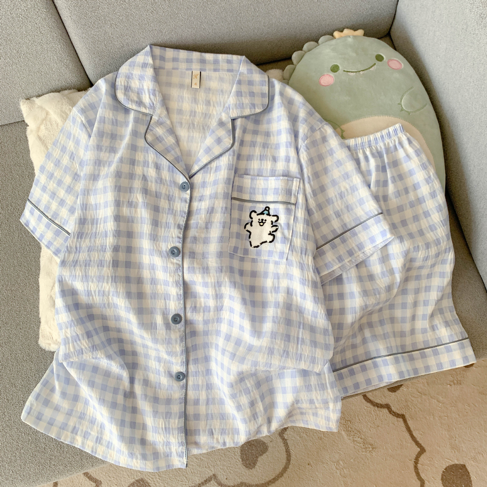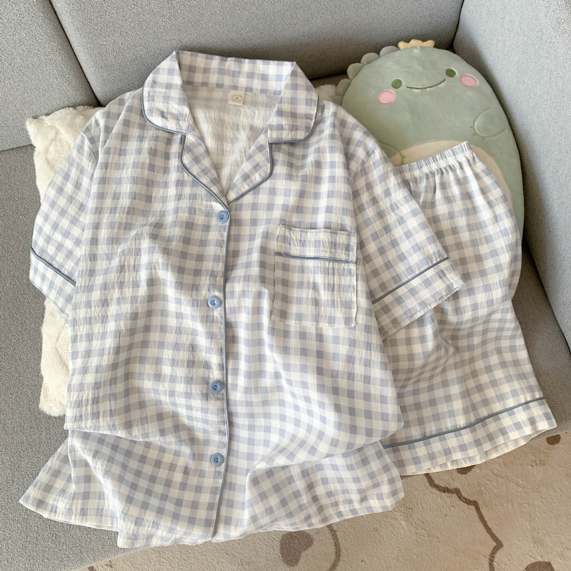云朵棉短袖短裤睡衣女夏季卡通翻领可爱蓝色小八休闲风家居服套装
