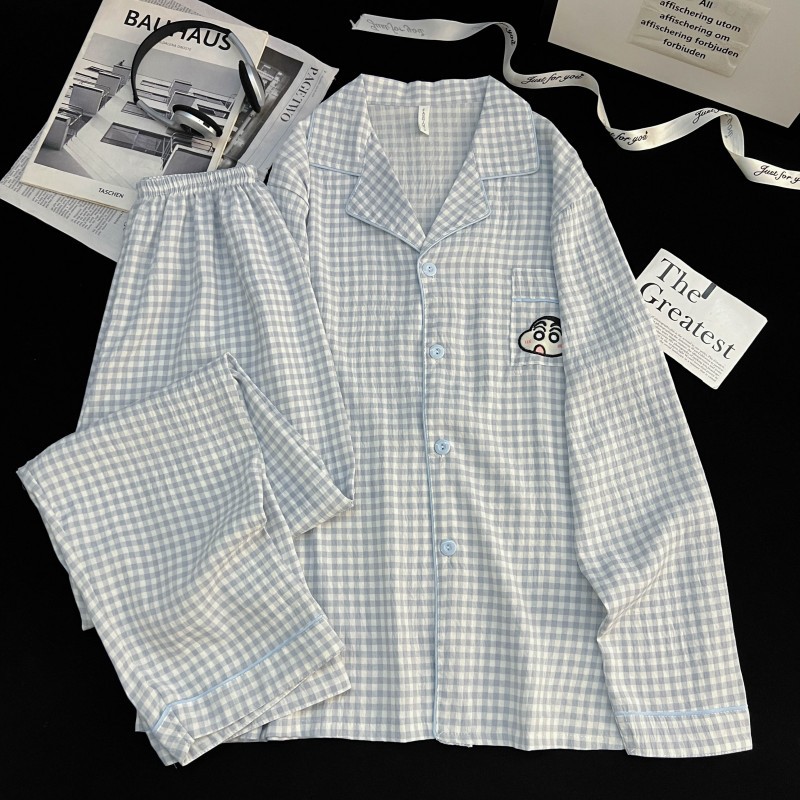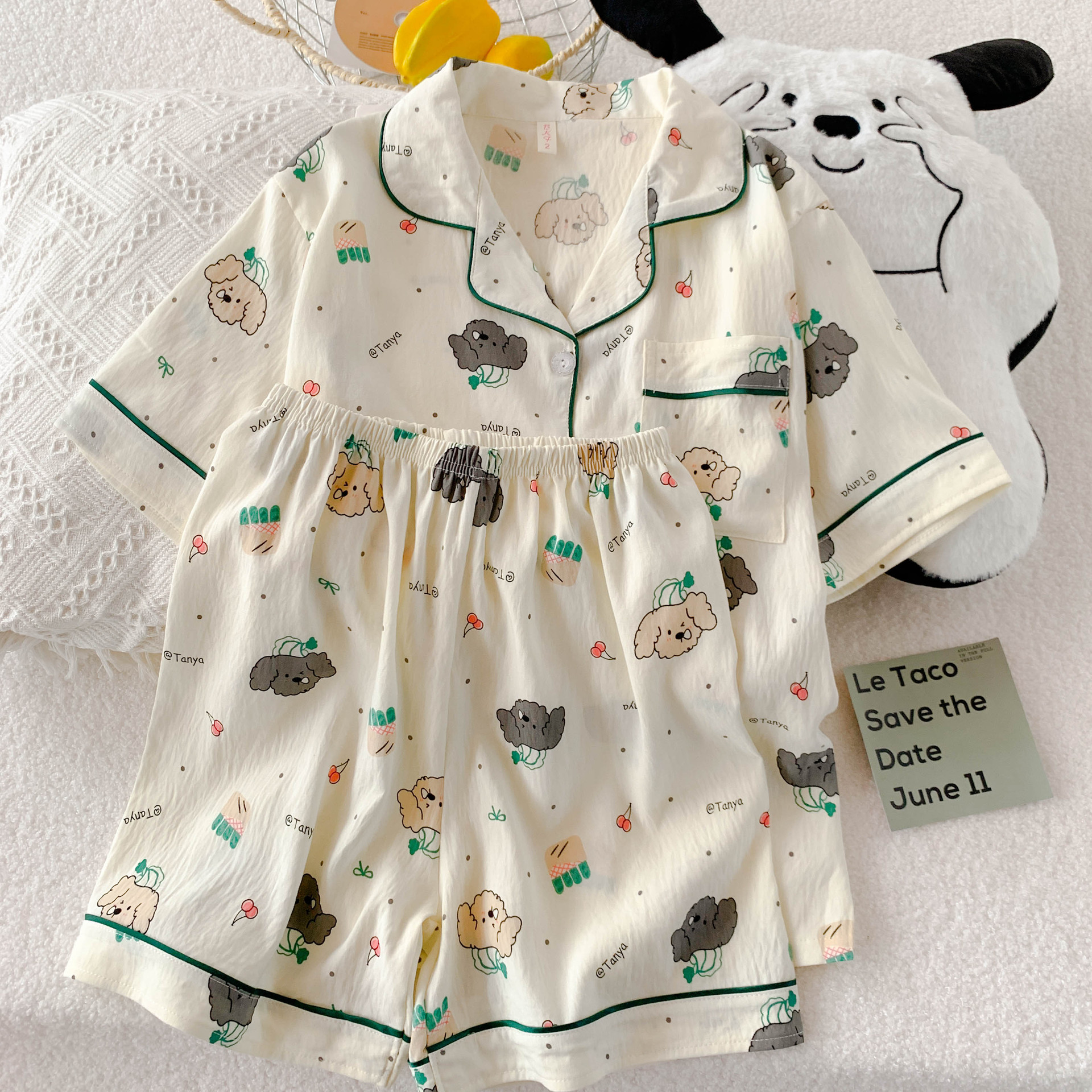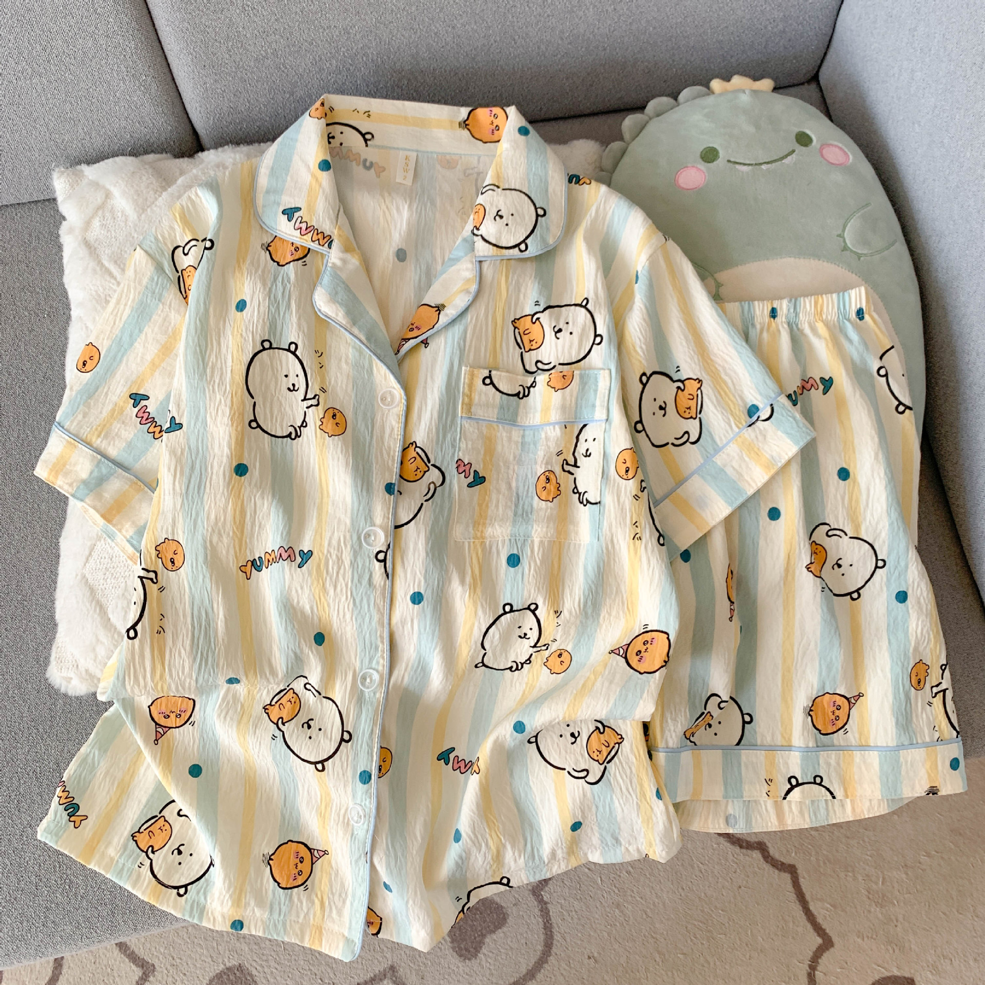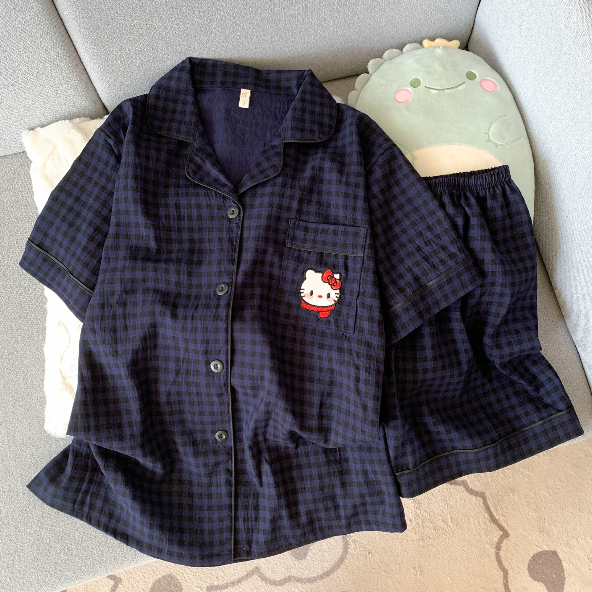 云朵棉短袖短裤睡衣女夏季卡通翻领可爱蓝色小八休闲风家居服套装