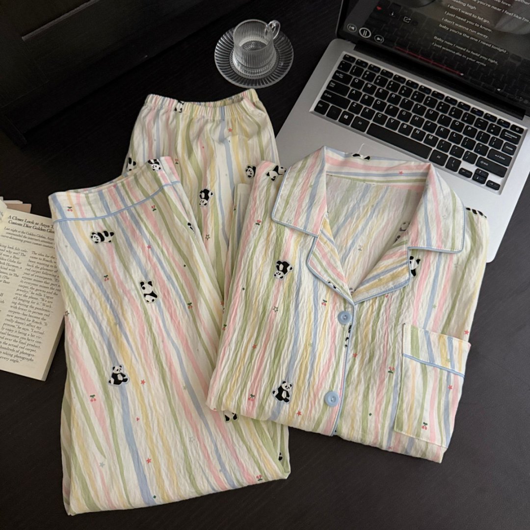 工厂现货云朵棉睡衣女长袖长裤翻领卡通彩色宽松细条纹家居服套装