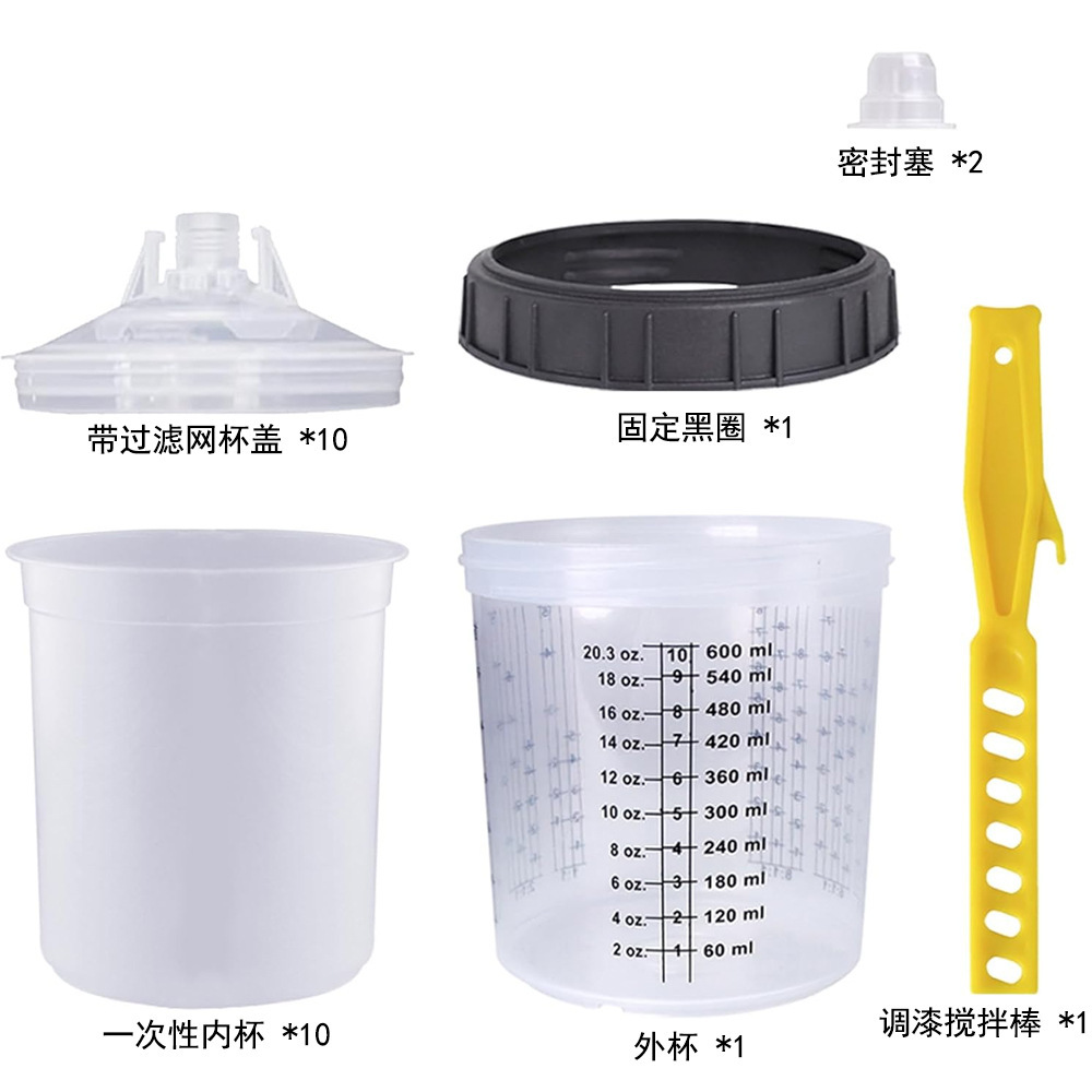 ペイントスプレーガン洗浄不要ポットセット使い捨てペイントカップスプレーガンポット600ml目盛り付き、漏れ防止、色分け付き