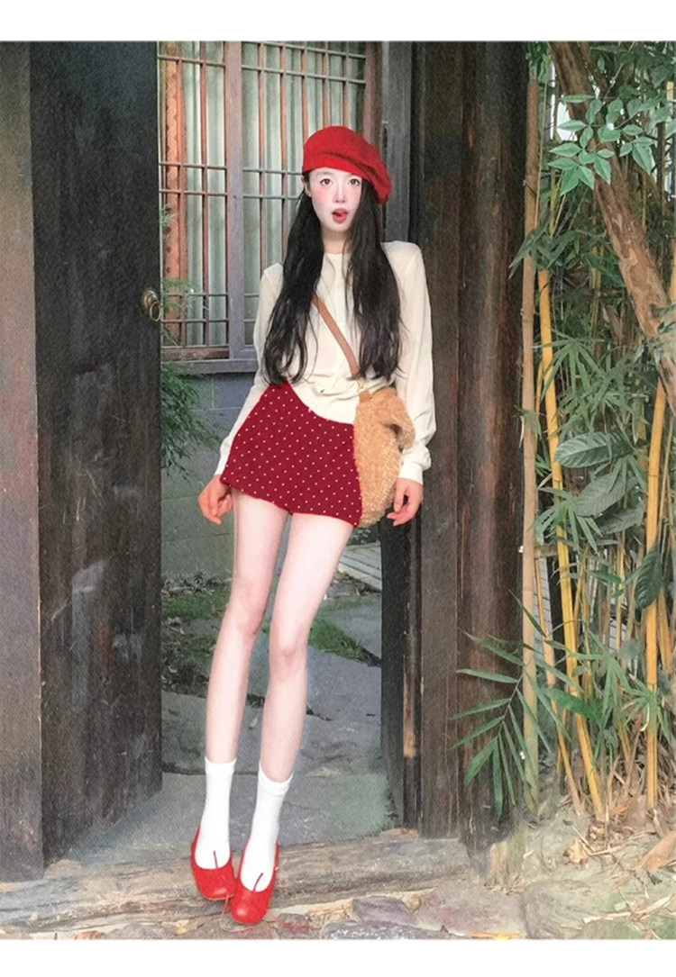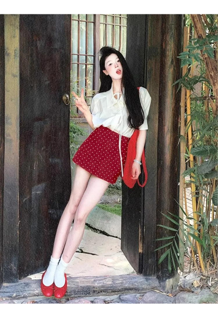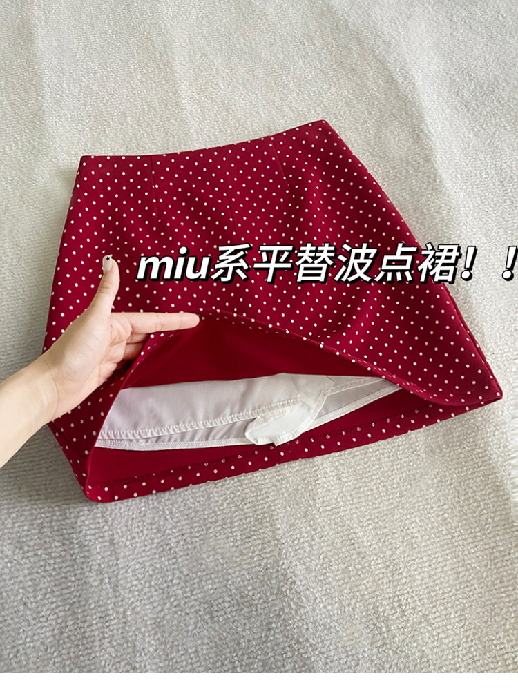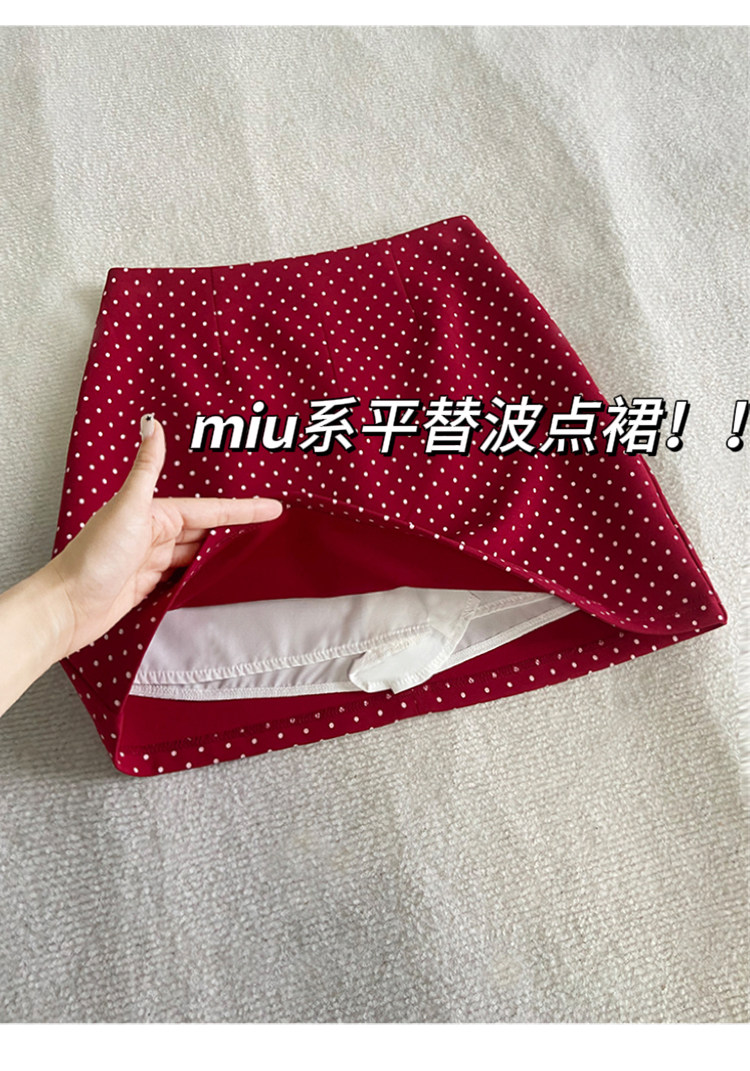 レッド水玉スカート レディース ミュウ風 ヒップカバー ショートスカート 夏 ウエスト絞り 小柄 Aラインスカート 夏