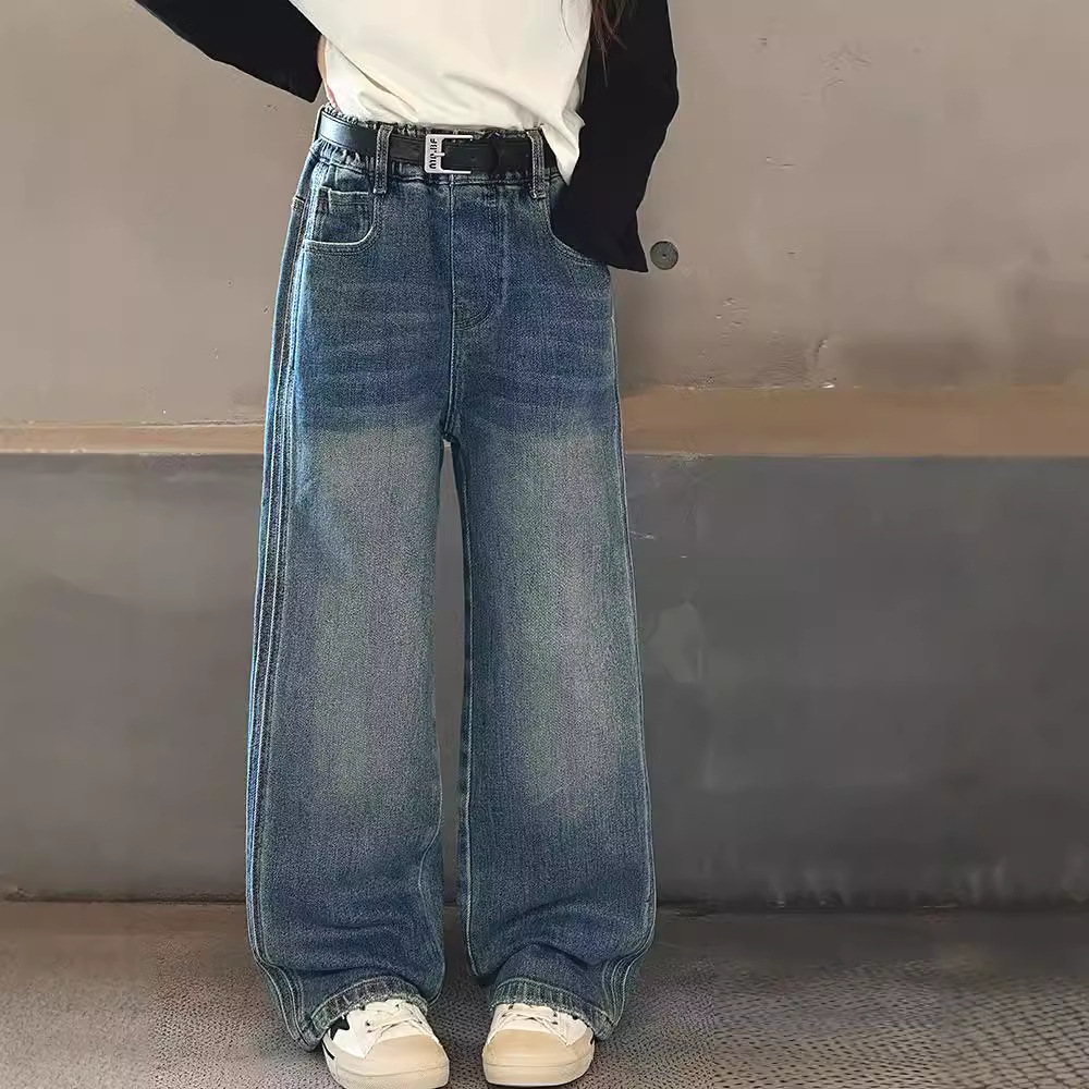 女の子用ワイドレッグジーンズ 春秋モデル 2024 子供用秋用ストレートパンツ 女の子用ゆったりパンツ 韓国風トレンド