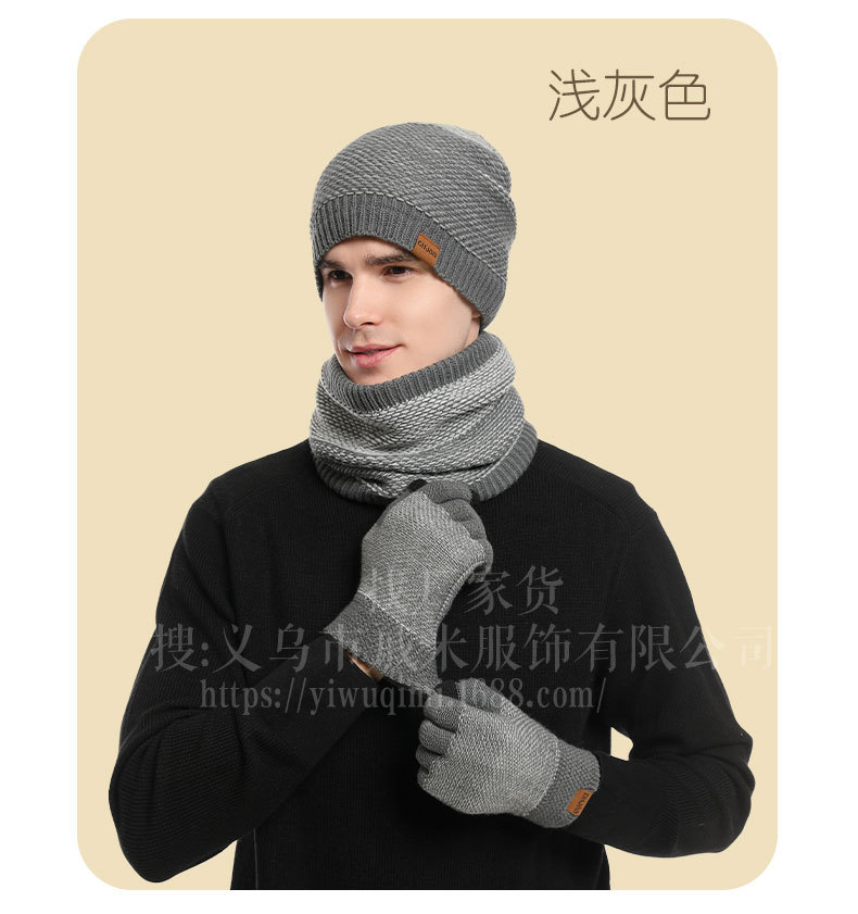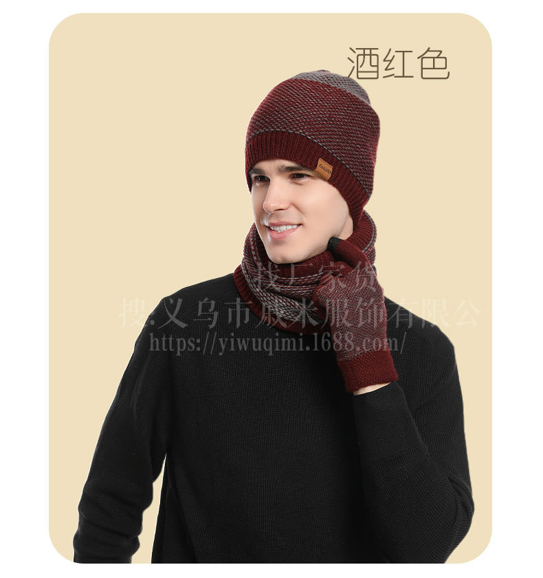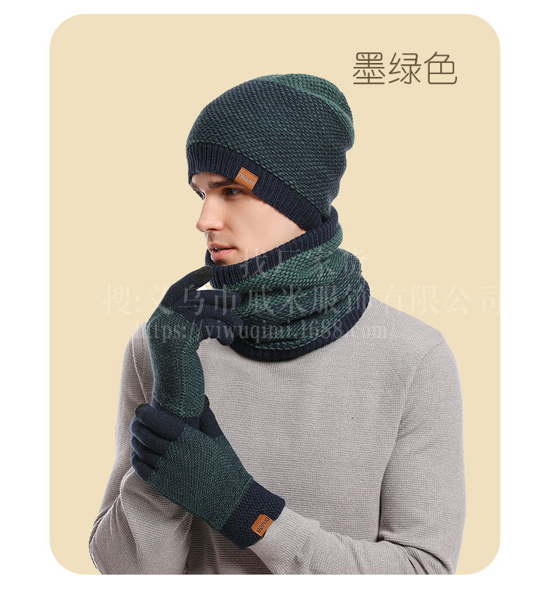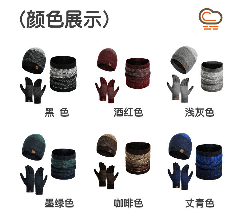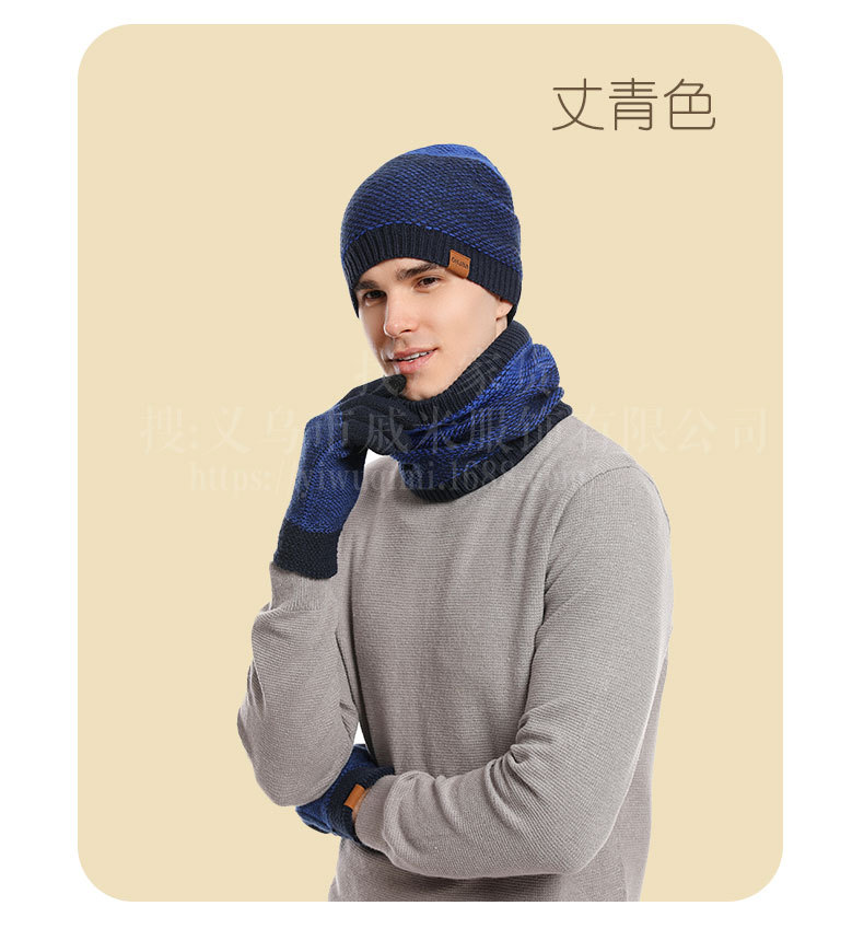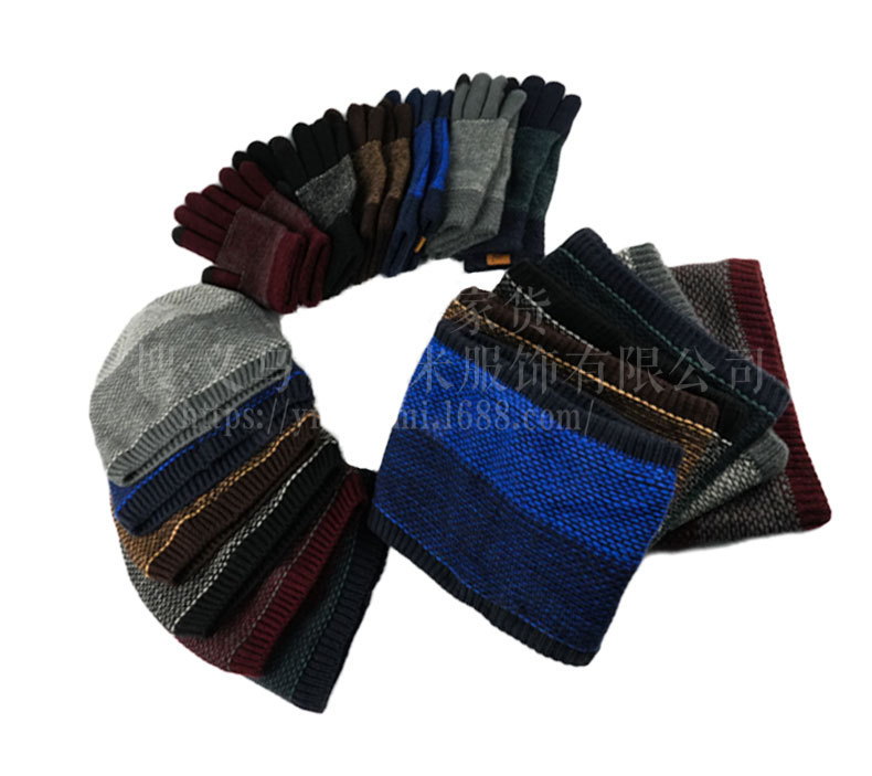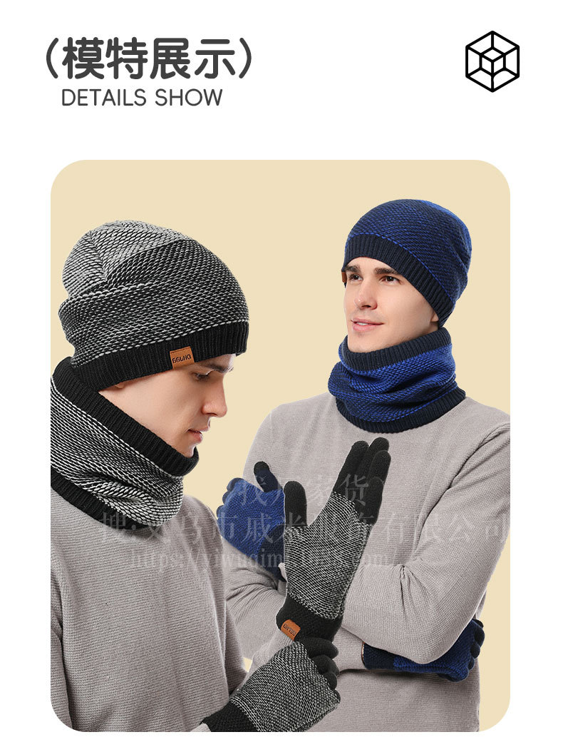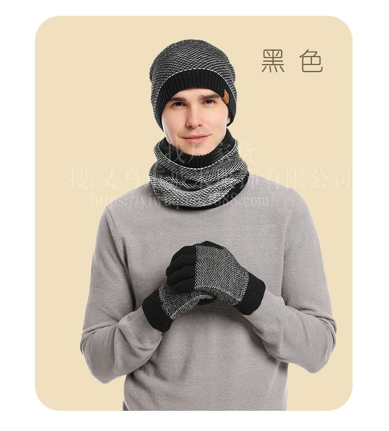 定制针织帽 男冬季加绒加厚防寒户外毛线针织帽子围脖手套三件套