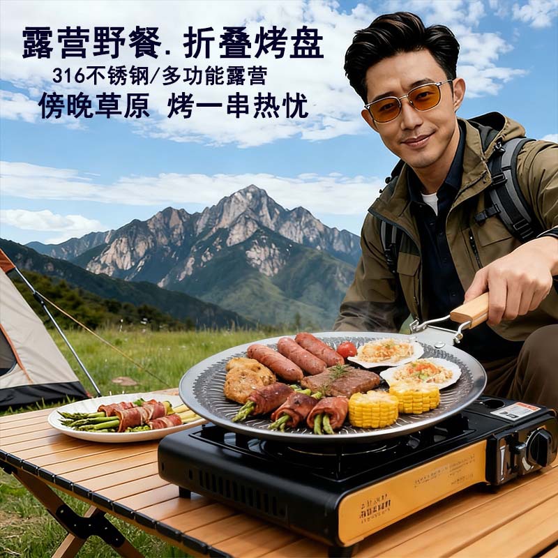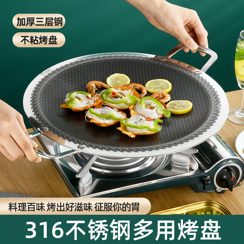 316不锈钢烤盘户外露营烧烤盘多功能家用烤肉店专用圆形煎盘便携