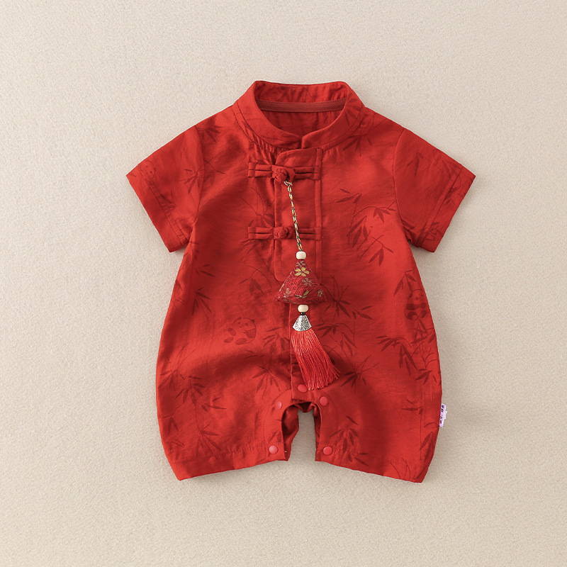 中国風のベビー夏服、男女兼用ベビージャンプスーツ、夏の満月百日赤いローブ、夏のハイハイ服