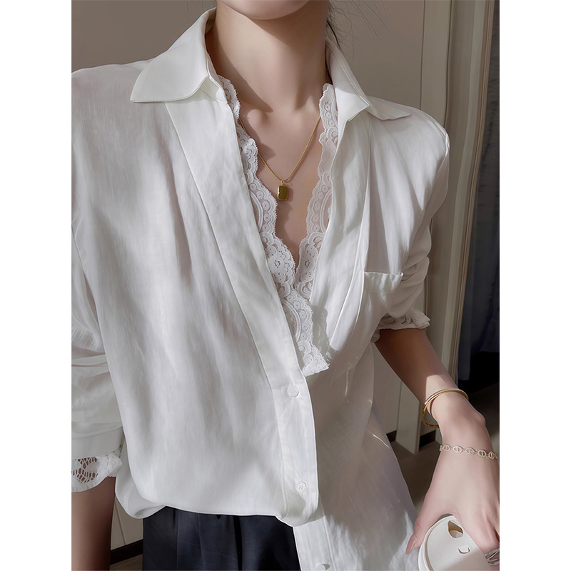 薄款简约风高级感白色假两件蕾丝拼接西装长袖宽松衬衫上衣女秋季