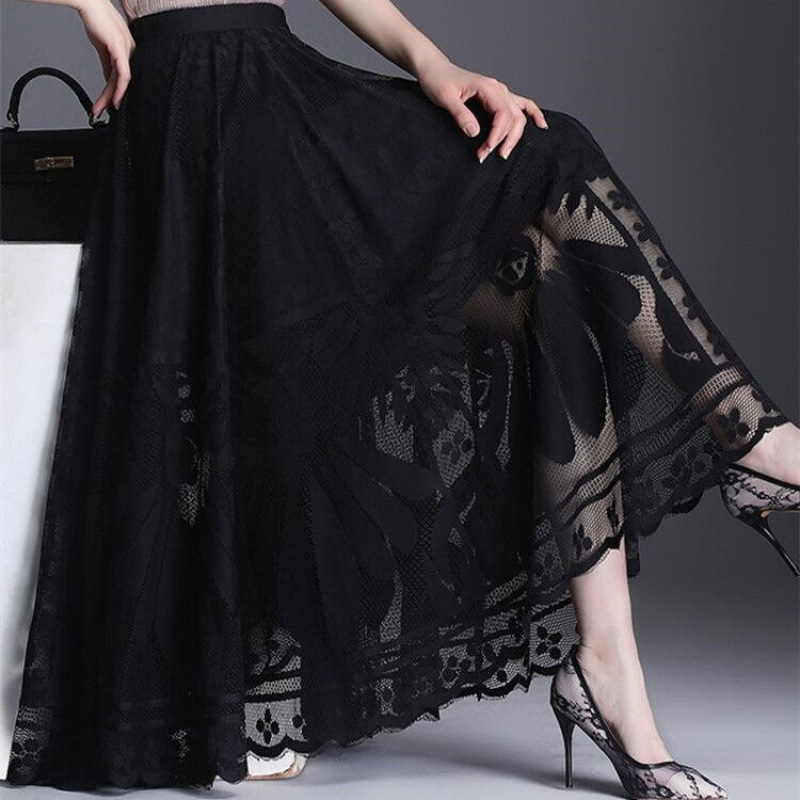 今年人気のレーストリムロングスカート、高級感とスリム感のある大振りメッシュフェアリープリーツスカート
