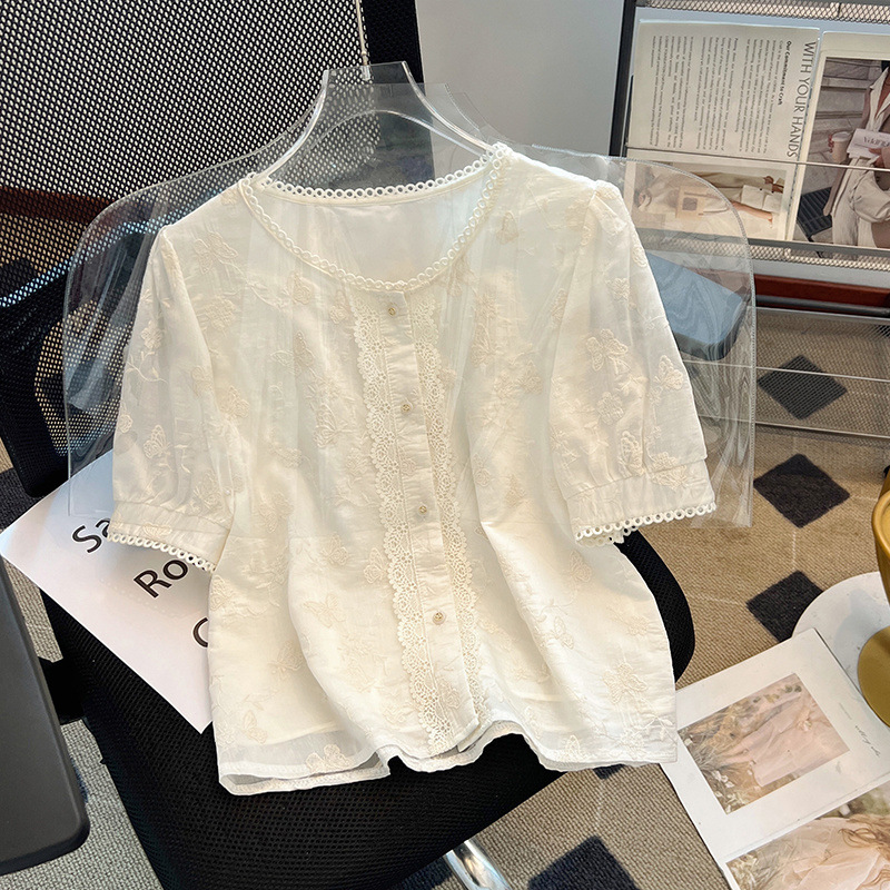 フランス式の泡の袖のレースのシャツの女性の上着の2025新型の夏の小さい背の名媛の小さい香風の半袖の小さいシャツ
