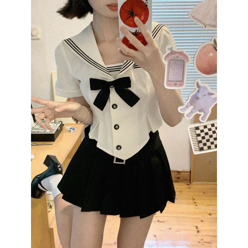 大きいサイズ半袖ネイビーカラーショートリボンシャツ+プリーツスカートレディース夏純粋な欲望と西洋スタイルの2点セット