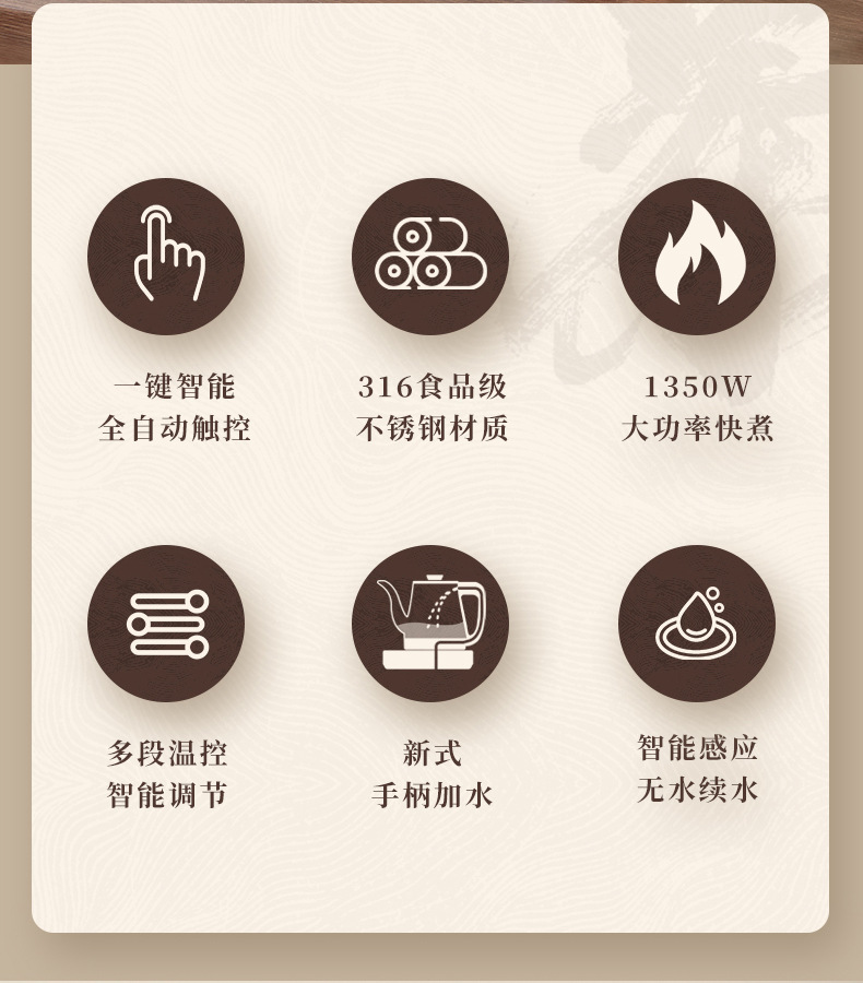 自動給水、空焚き防止、過熱保護、インテリジェントな温度制御、自動電源オフ、静音、取り外し可能で洗える、視覚的な温度