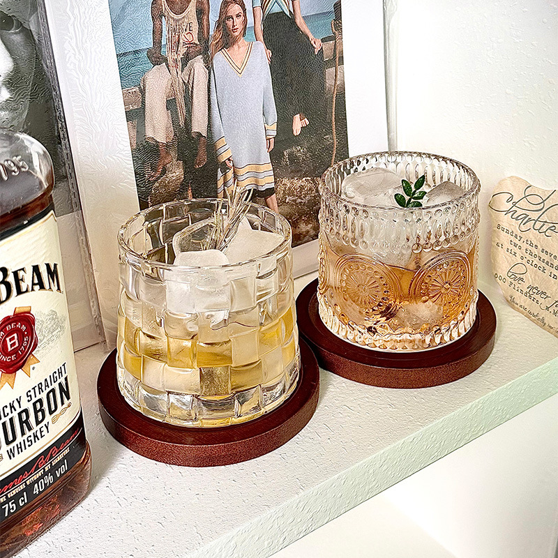 复古ins带杯垫平底杯梯形玻璃创意高级感威士忌酒杯咖啡杯冷萃杯