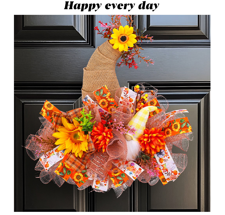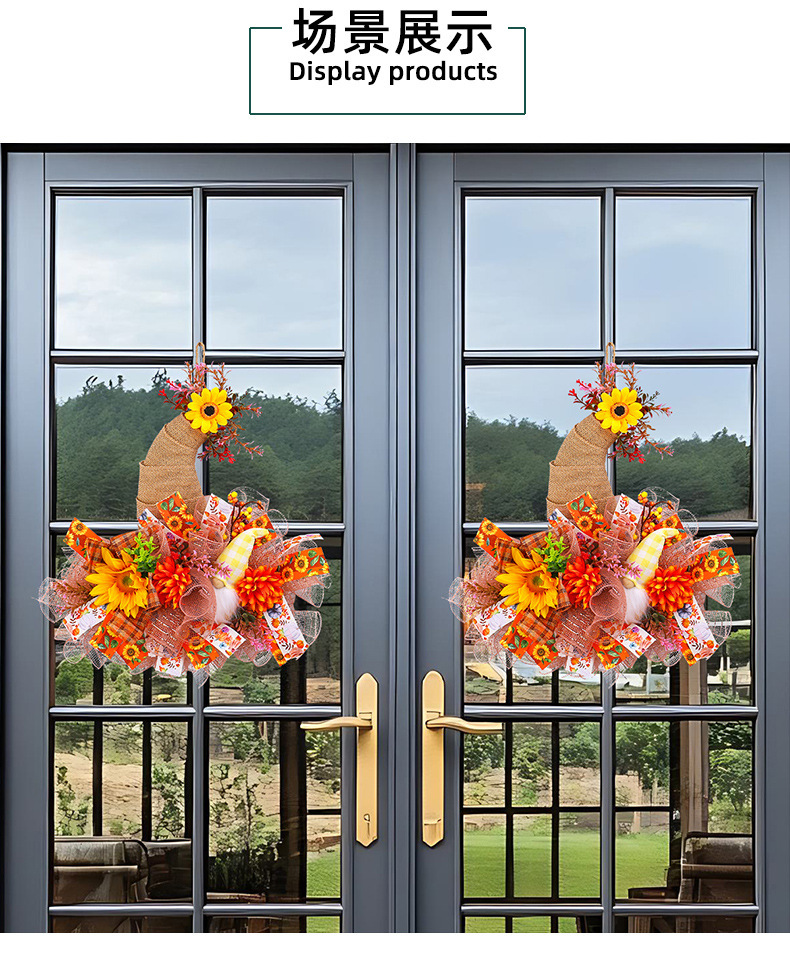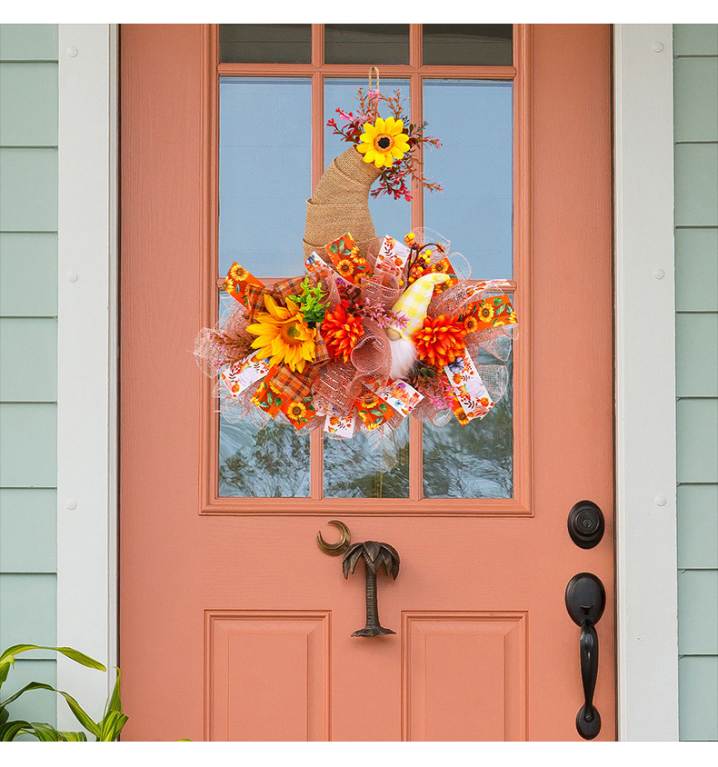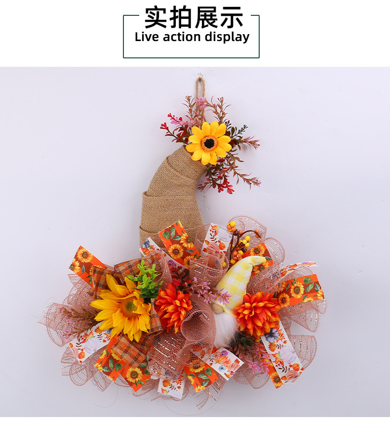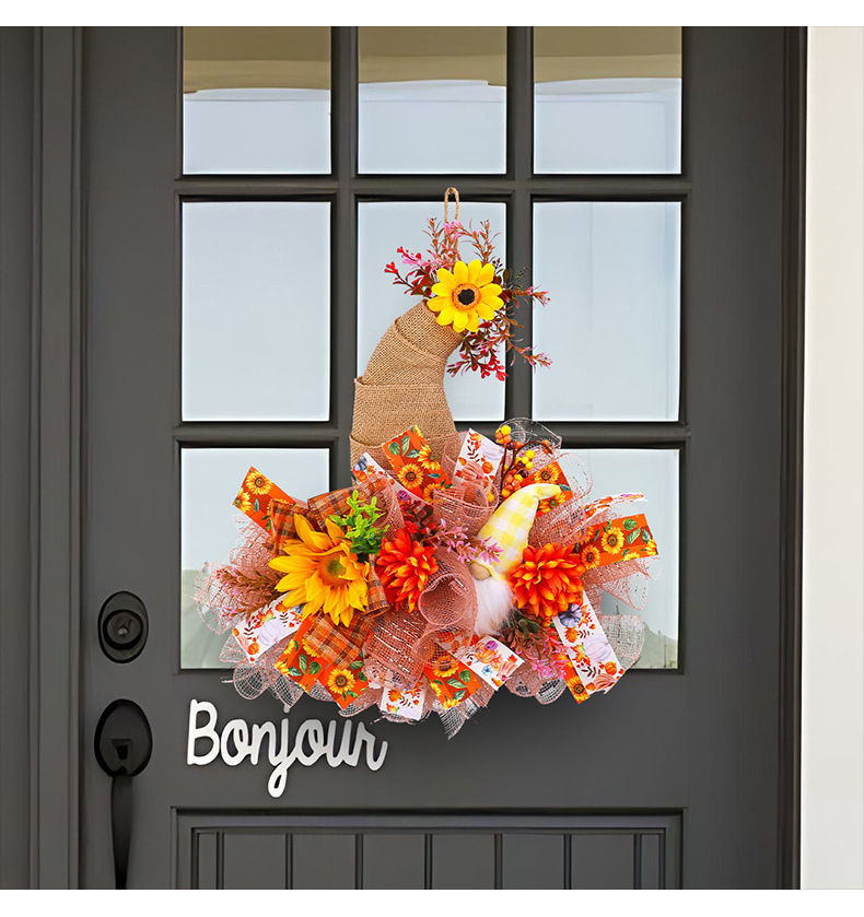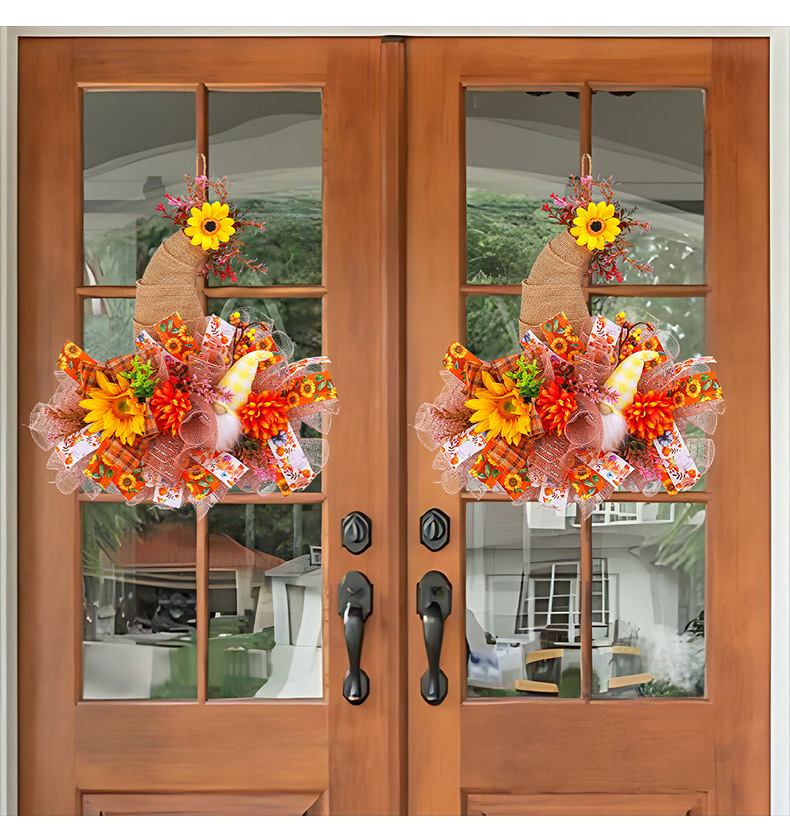アマゾン秋のメッシュ人形花輪ドアハンギング、庭のひまわり壁掛け、収穫祭の装飾小道具
