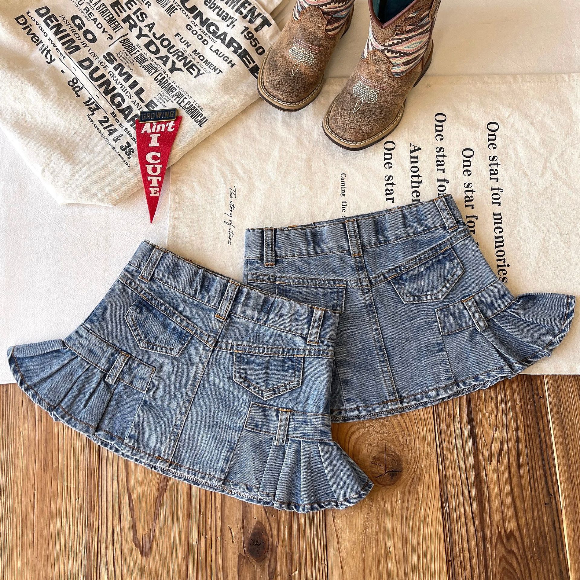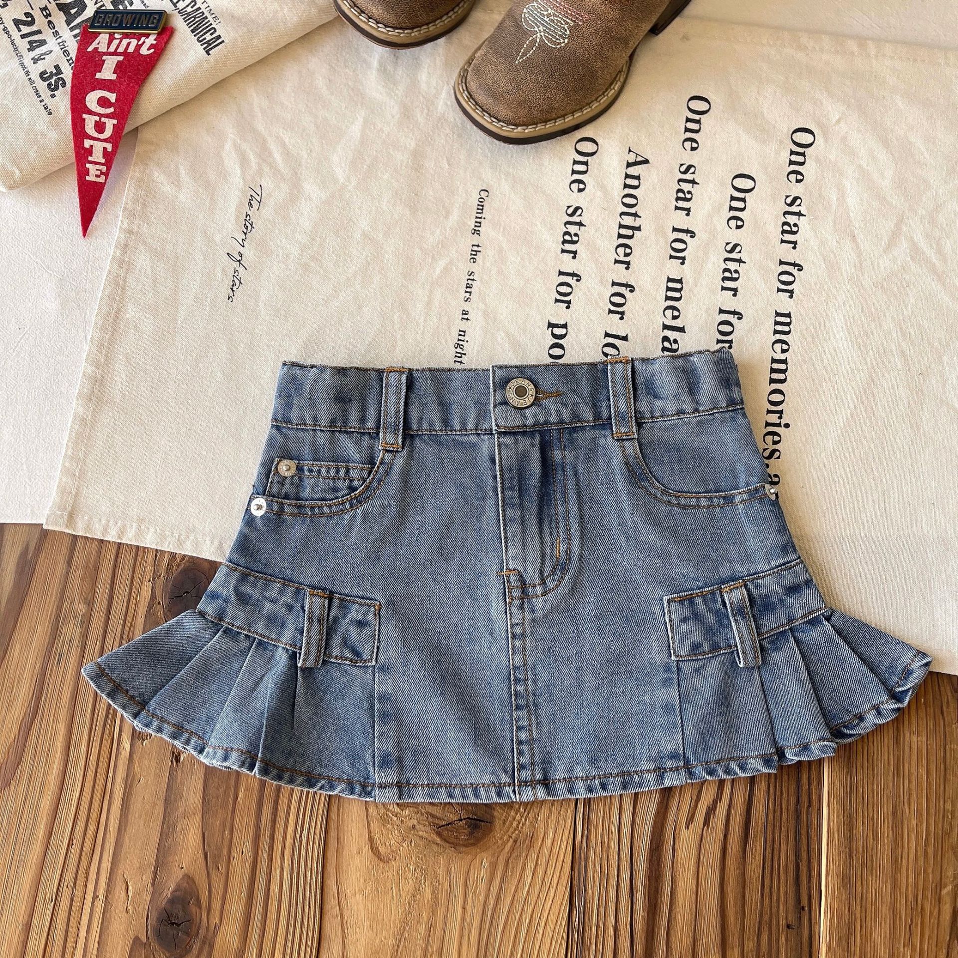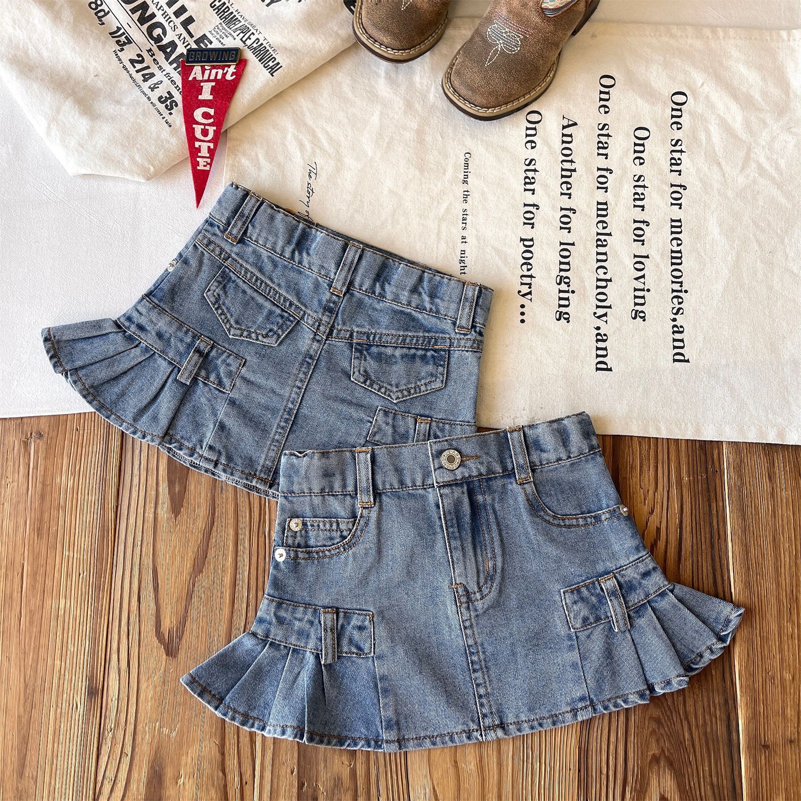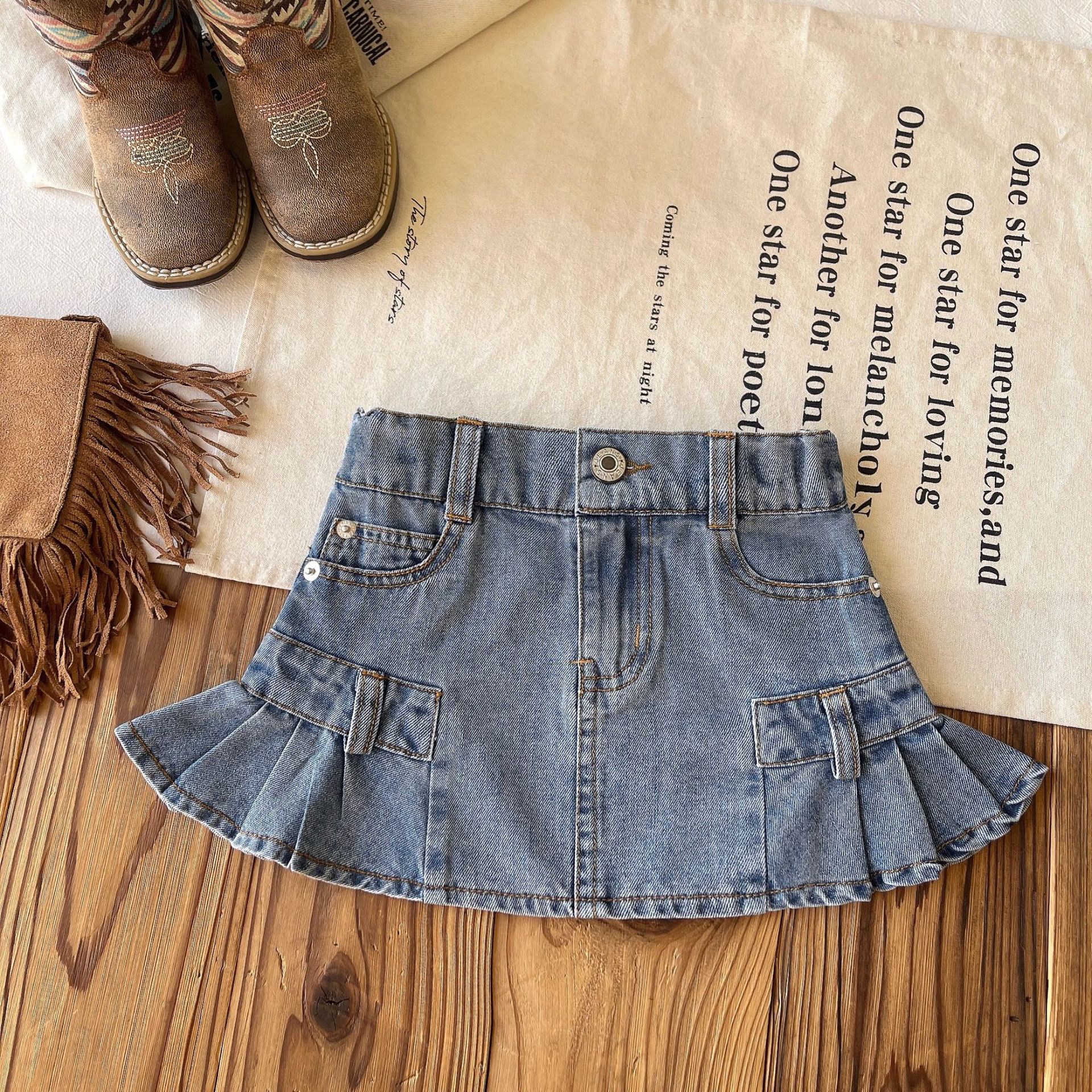 【现货】日系中古女童复古口袋木耳边牛仔花苞裙短裙