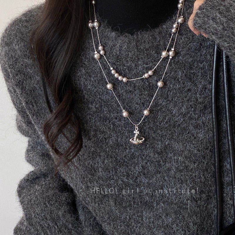 土星吊坠长款叠戴灰珍珠项链女秋冬轻奢高级感气质毛衣链配饰品