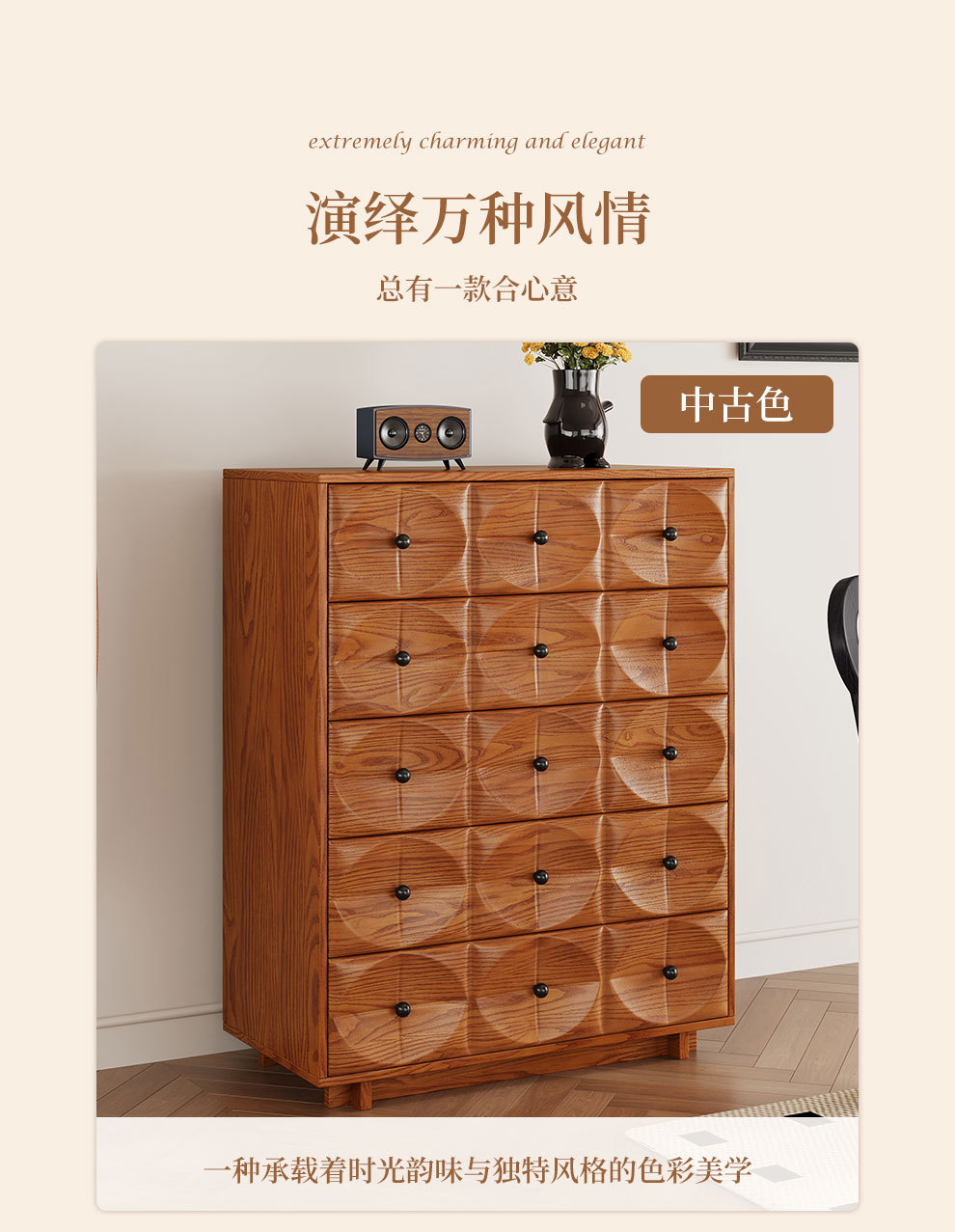 中世スタイルの引き出しキャビネット、5つの引き出しキャビネット、寝室の収納キャビネット、無垢材のベッドサイドキャビネット、収納キャビネット、壁に一体化された5つの引き出しキャビネット
