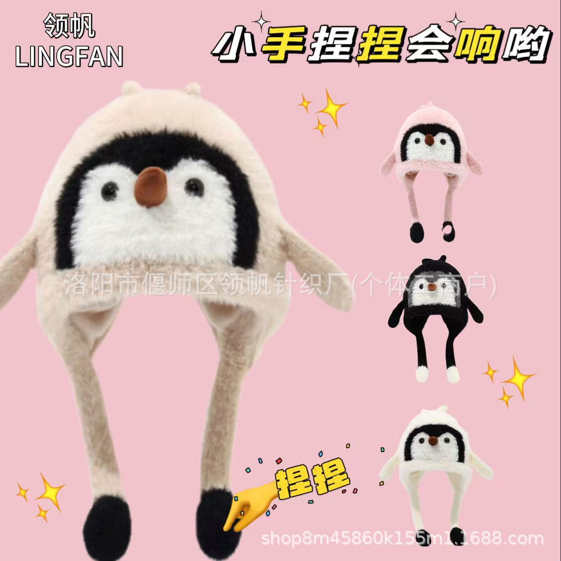 秋冬季新款儿童可爱企鹅毛绒帽保暖加厚小手捏捏会响圆顶护耳帽子