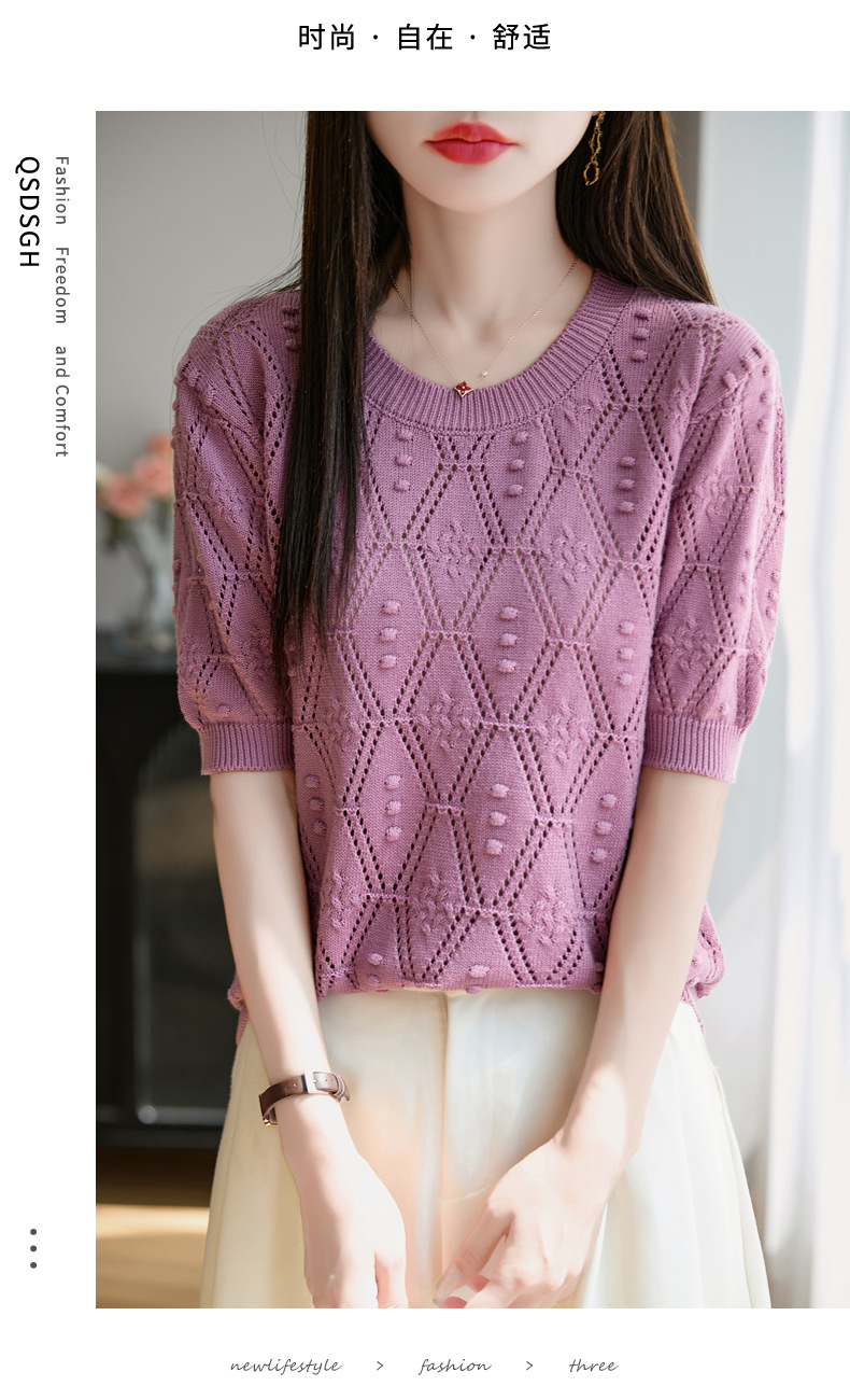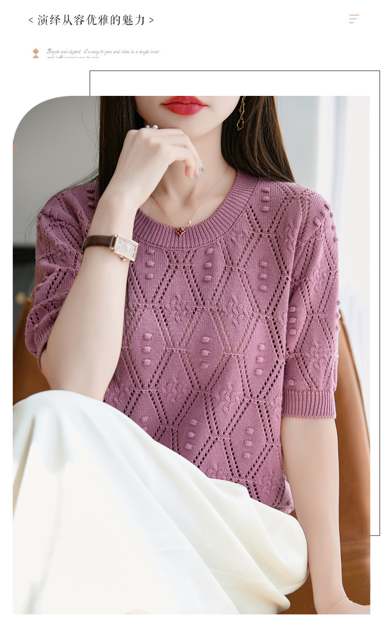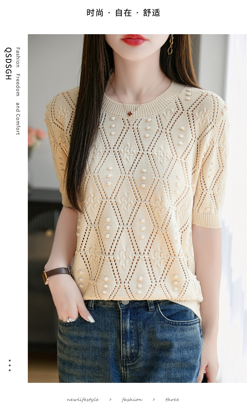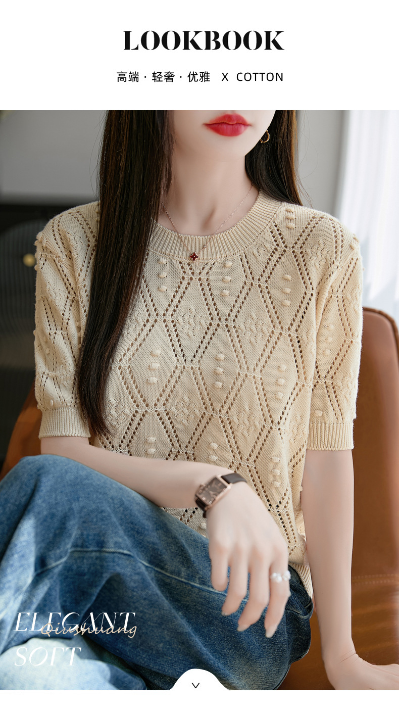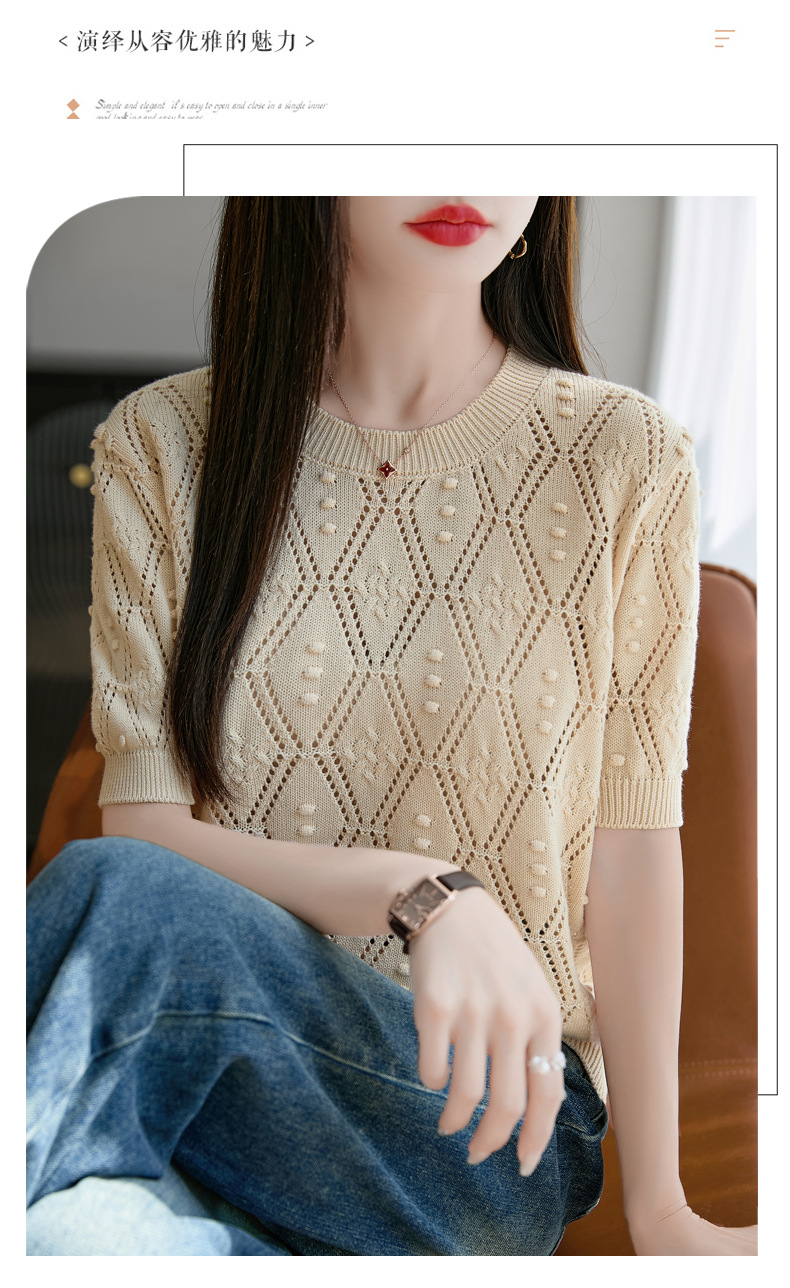 純綿のフランス式の透かし彫りのtシャツのニットの女性の夏のタイプのファッションの洋風はゆったりしていて、痩せています。