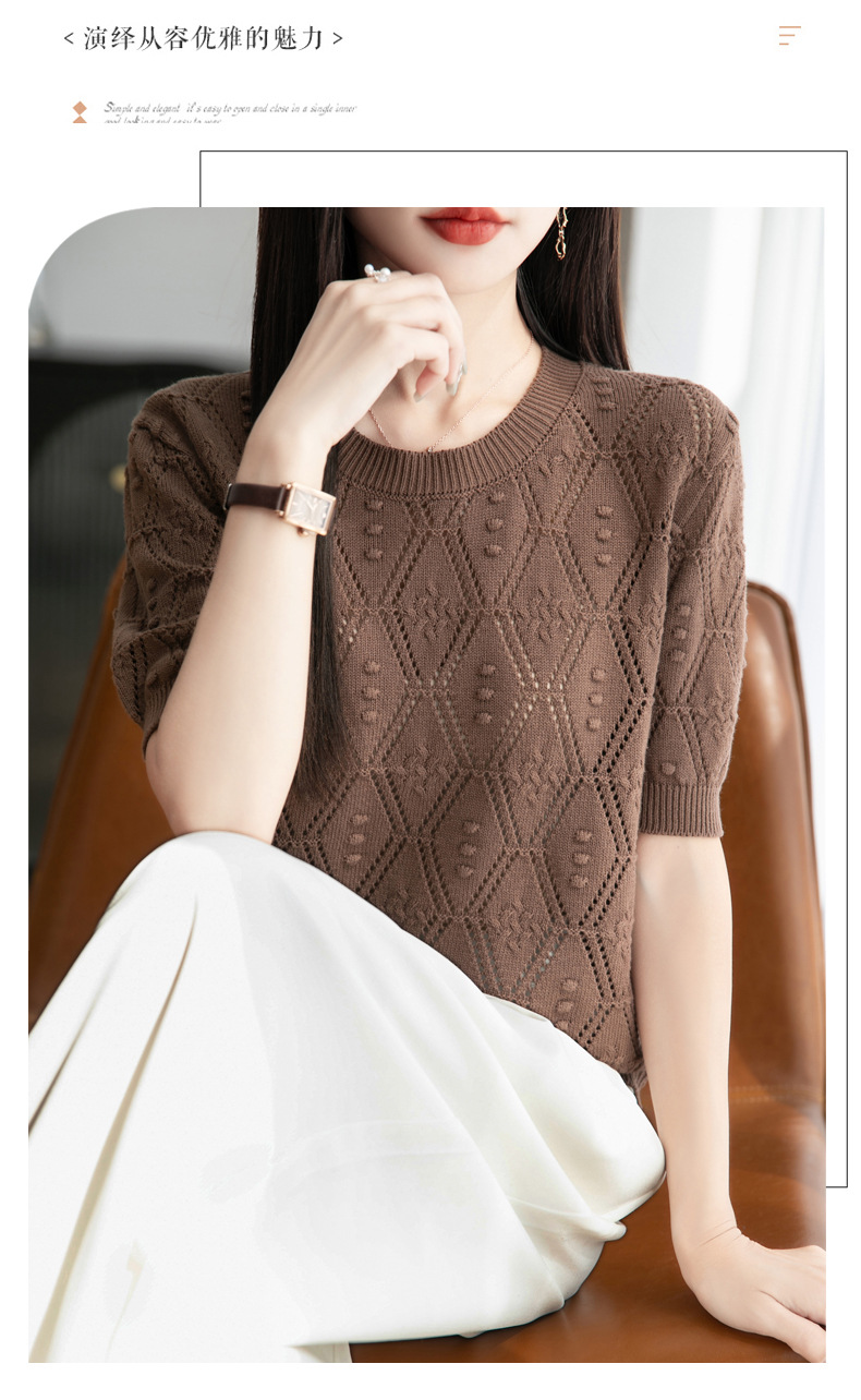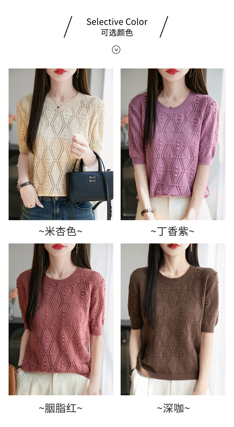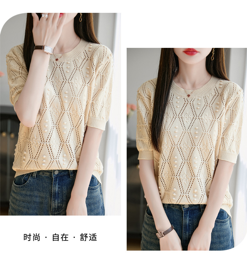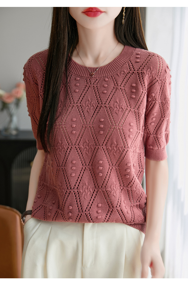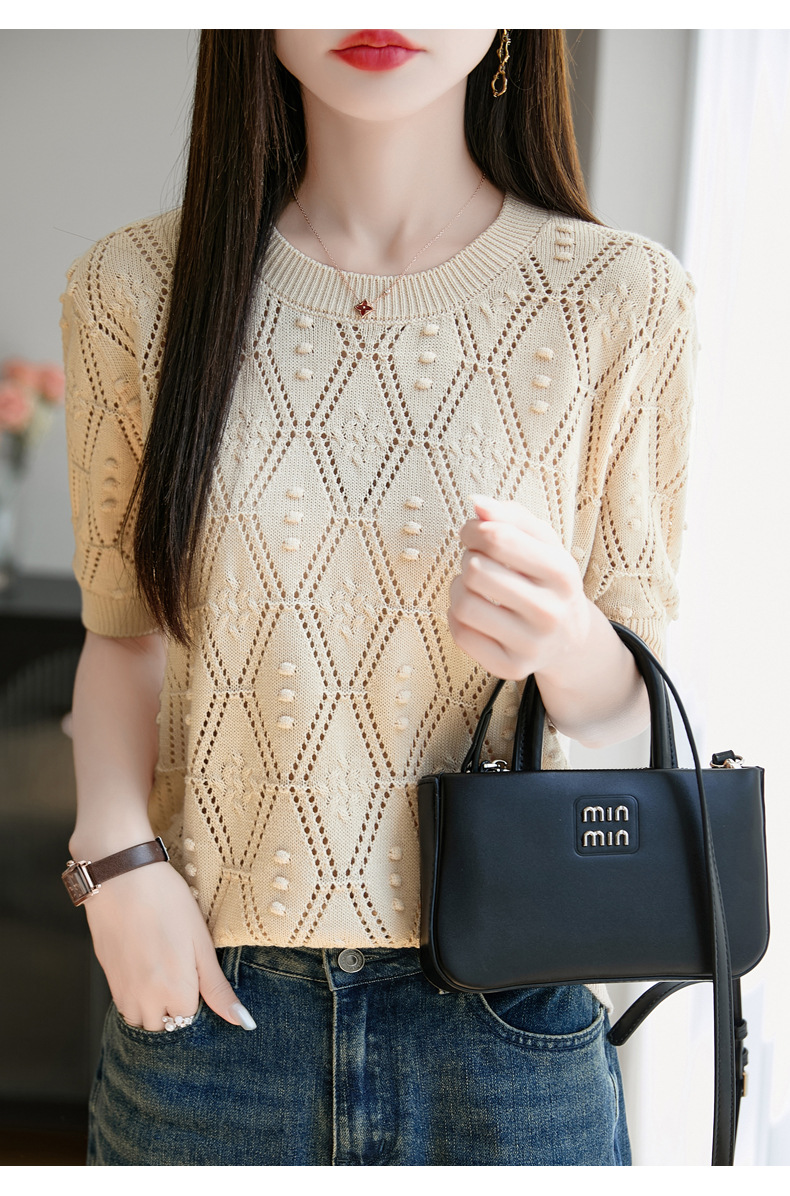 純綿のフランス式の透かし彫りのtシャツのニットの女性の夏のタイプのファッションの洋風はゆったりしていて、痩せています。