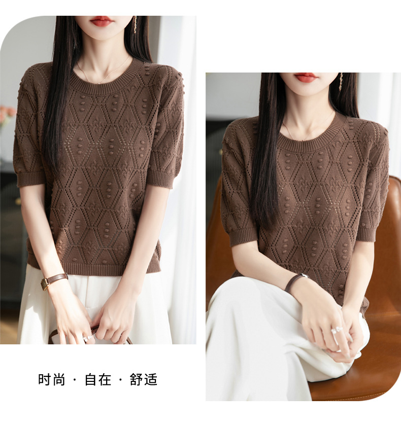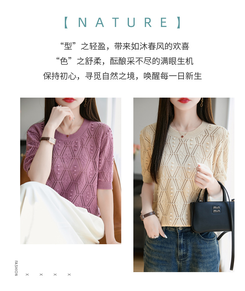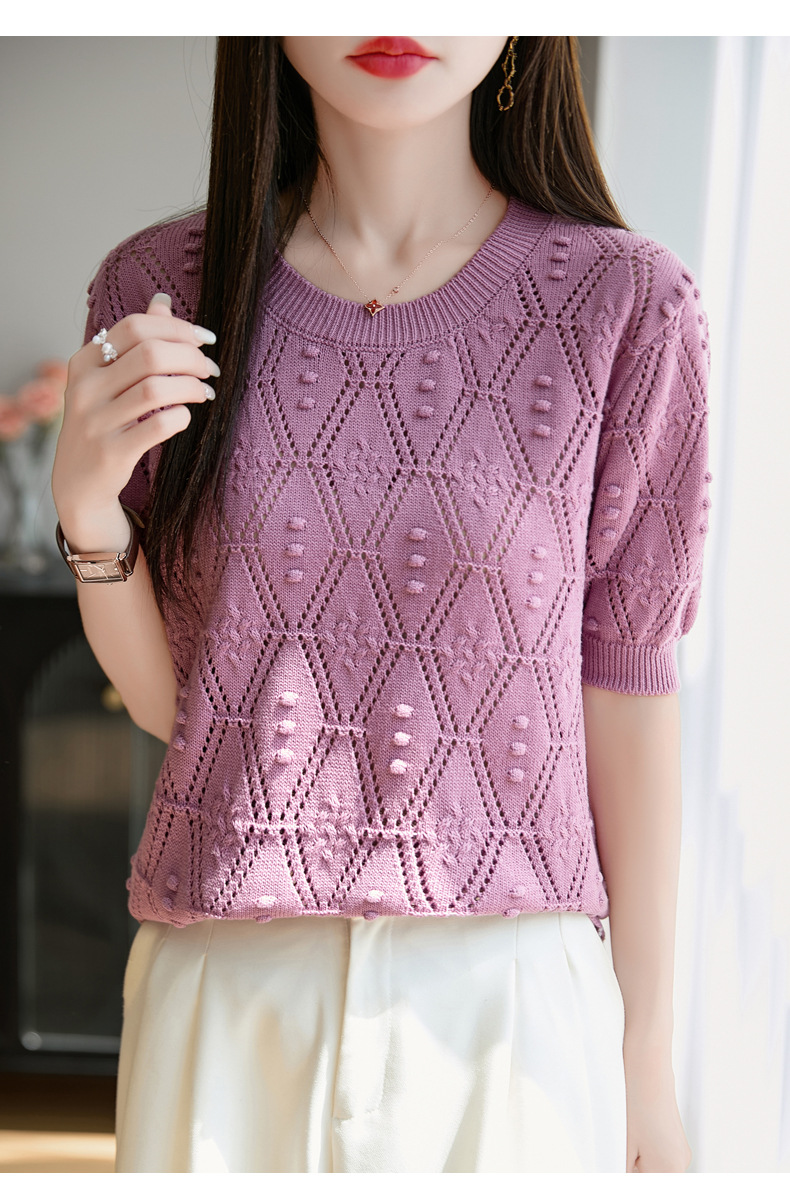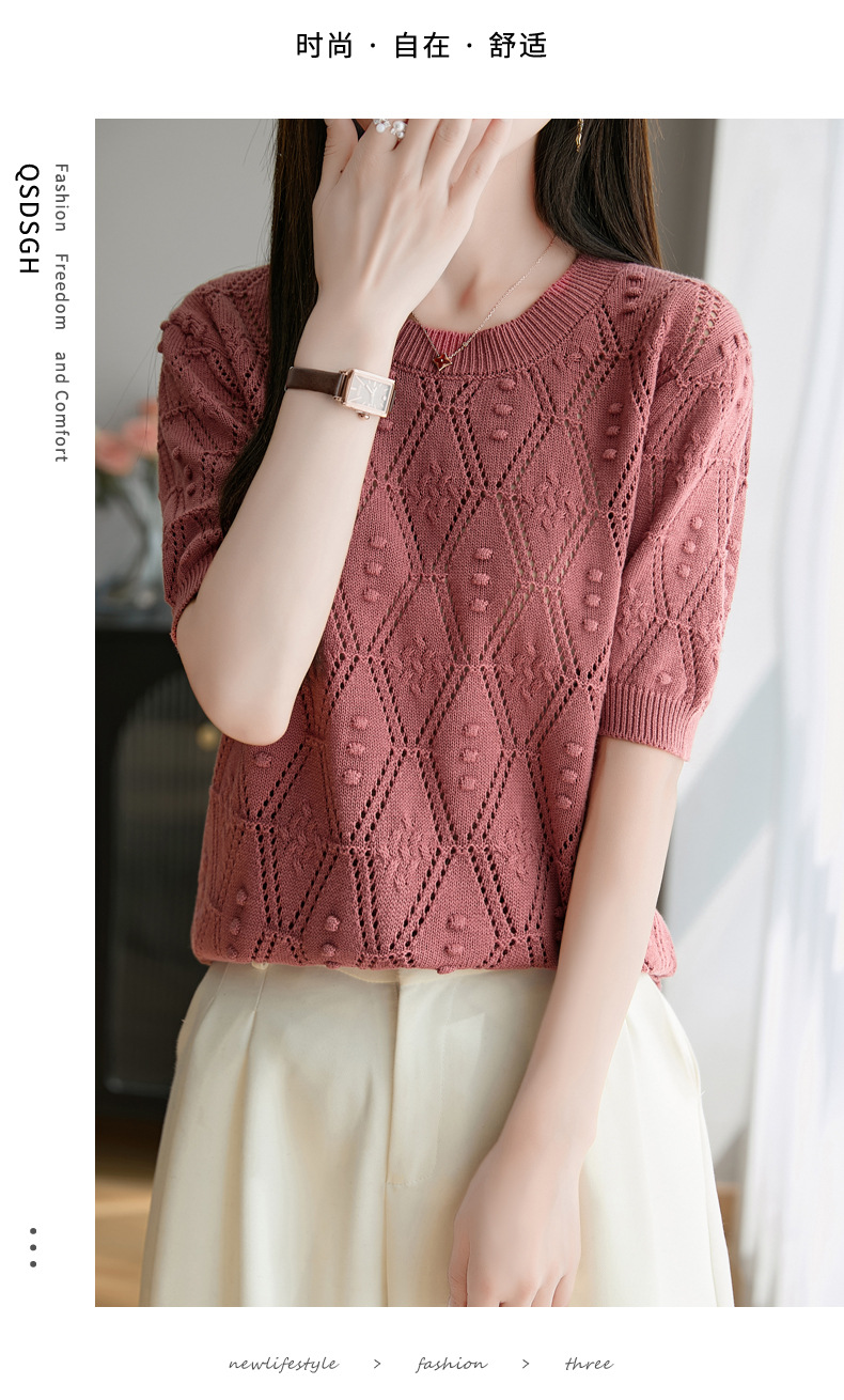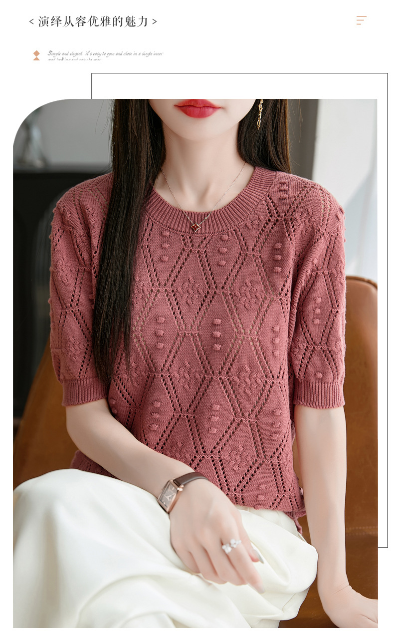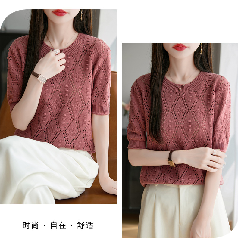 純綿のフランス式の透かし彫りのtシャツのニットの女性の夏のタイプのファッションの洋風はゆったりしていて、痩せています。