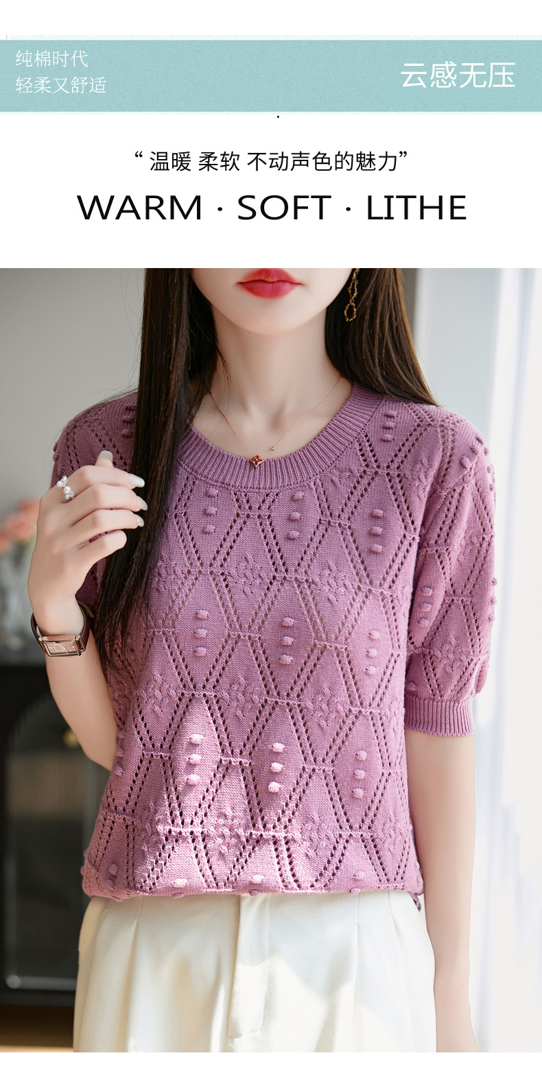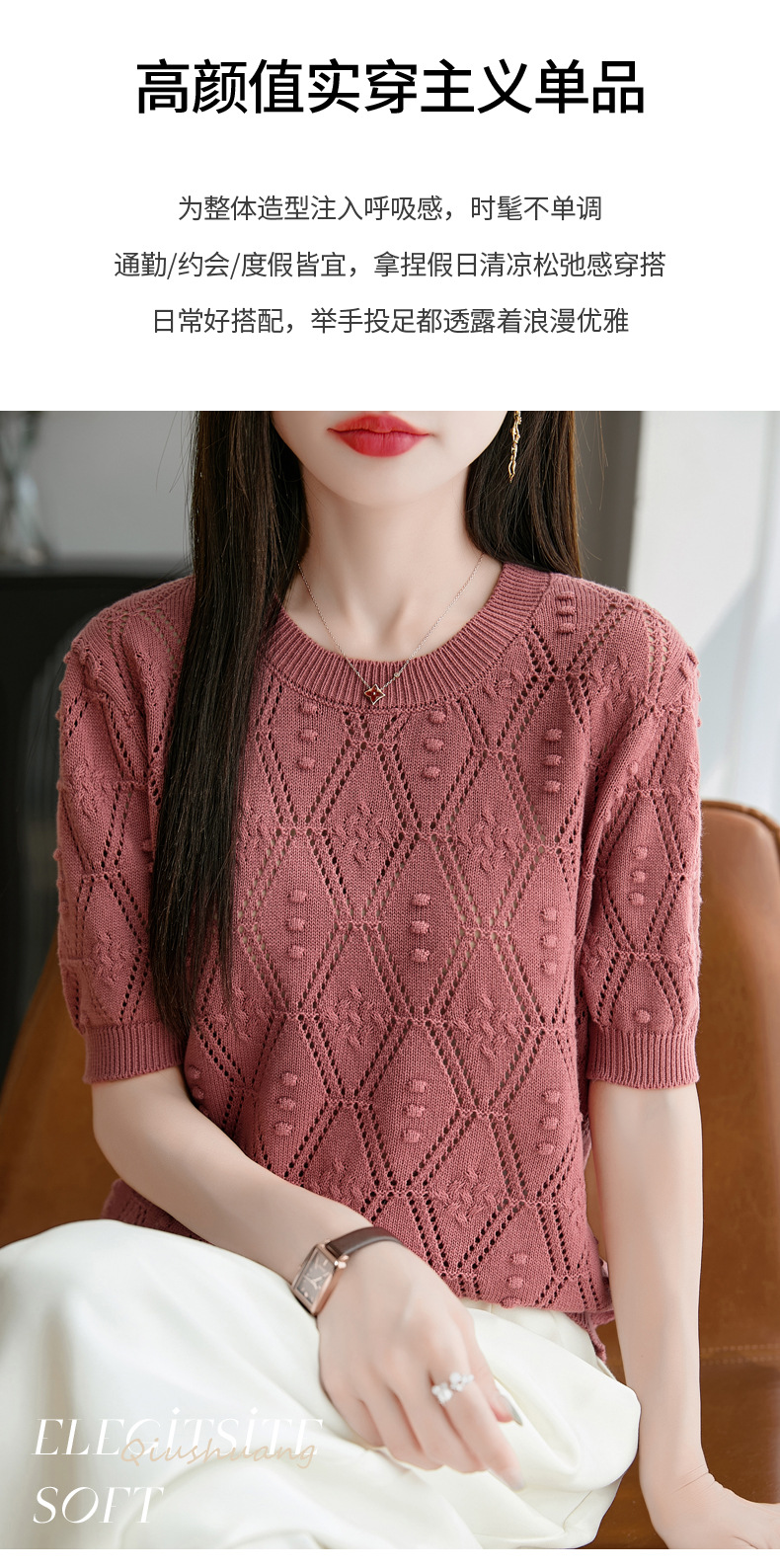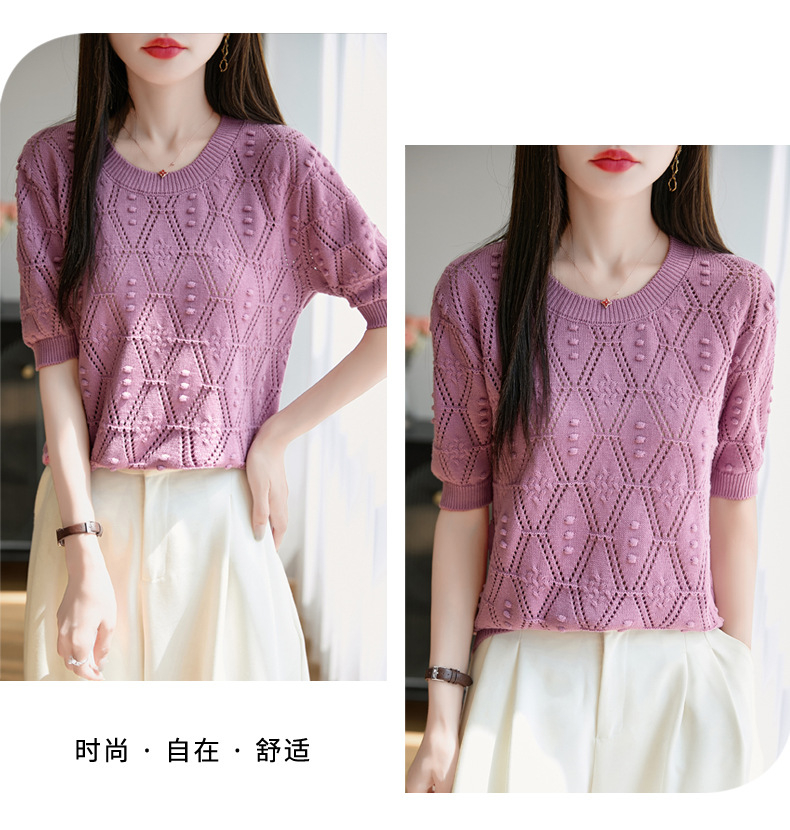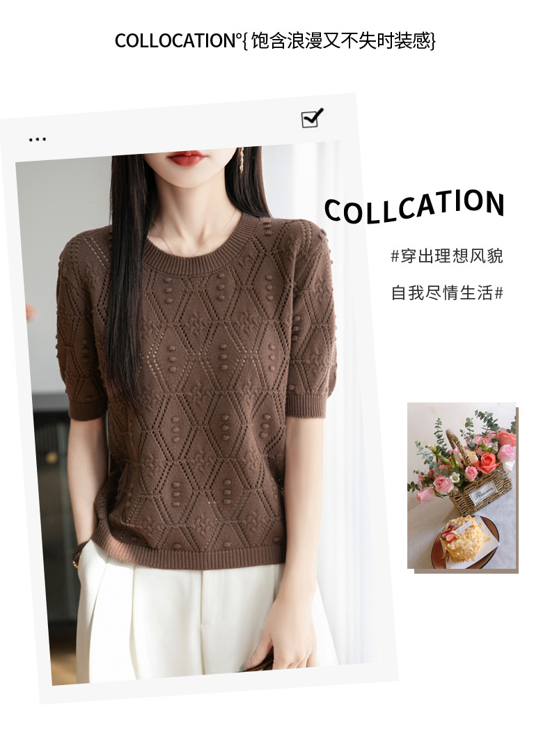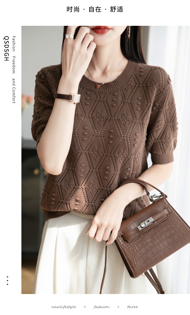 純綿のフランス式の透かし彫りのtシャツのニットの女性の夏のタイプのファッションの洋風はゆったりしていて、痩せています。