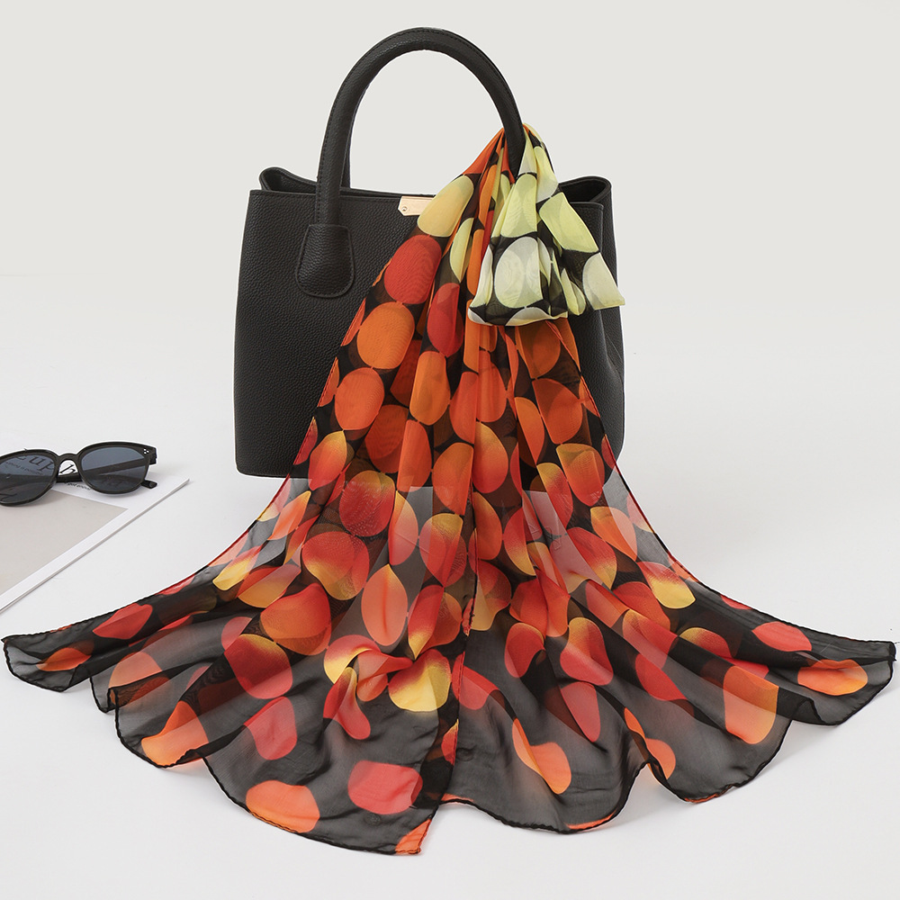 春秋のジョシュアの波点のシルクのスカーフの大きい赤いマフラーの丸い点のガーゼの女性の薄いタイプのシフォンの長いタオルの日焼け止めのショール
