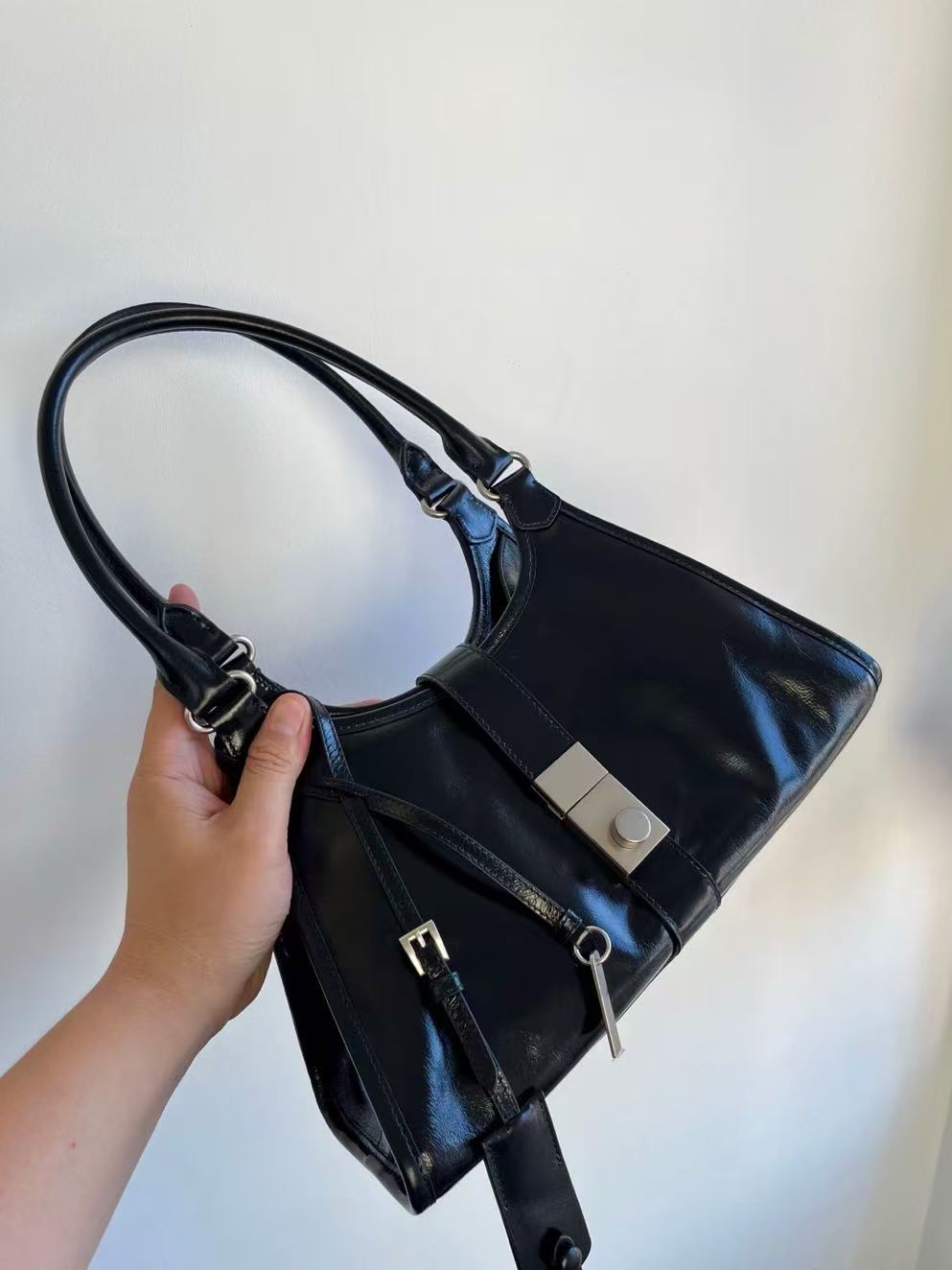 P's バゲットバッグ 2025 春夏新作 オイルワックス本革 バックル付き ロングハンドバッグ 第一層牛革 ショルダー 脇バッグ