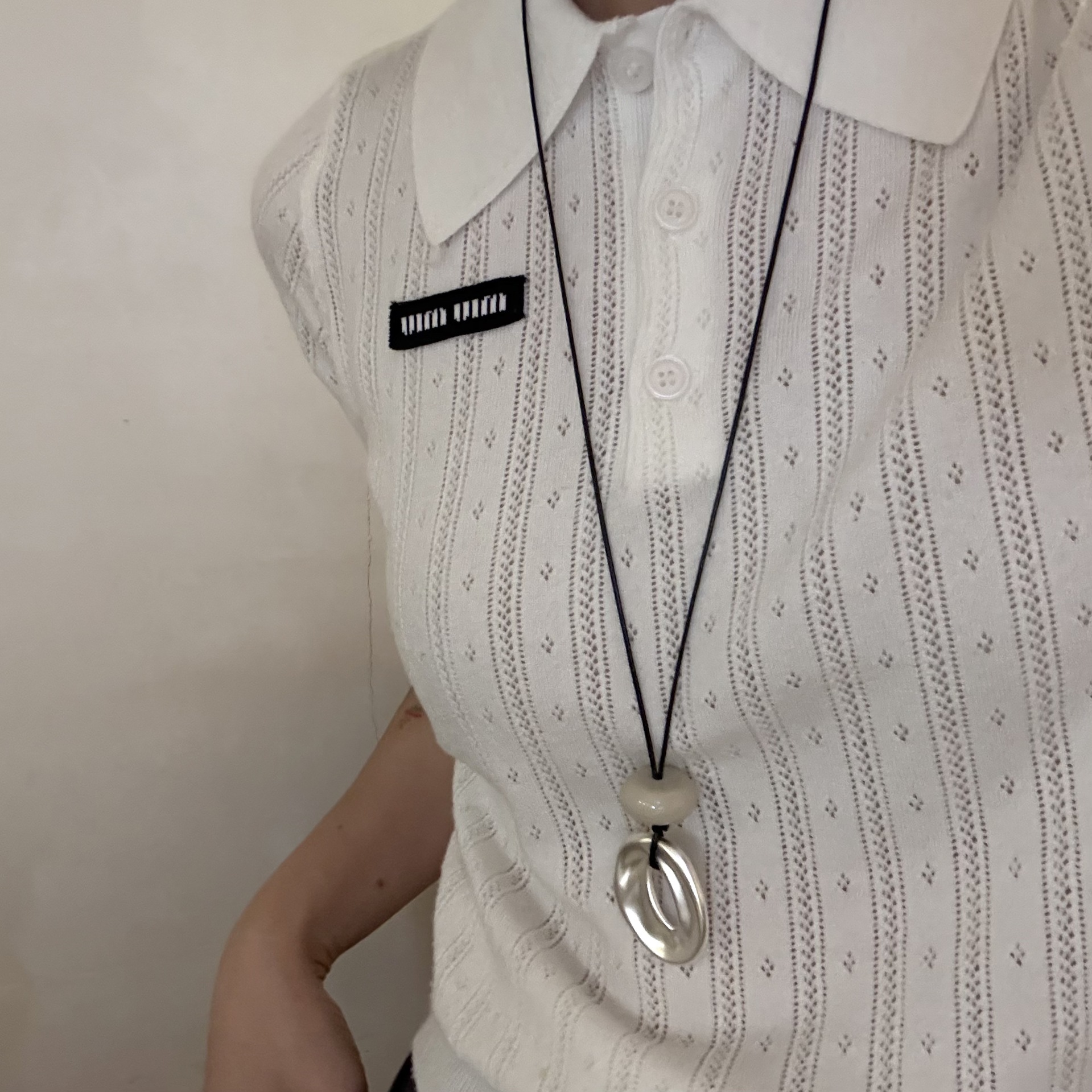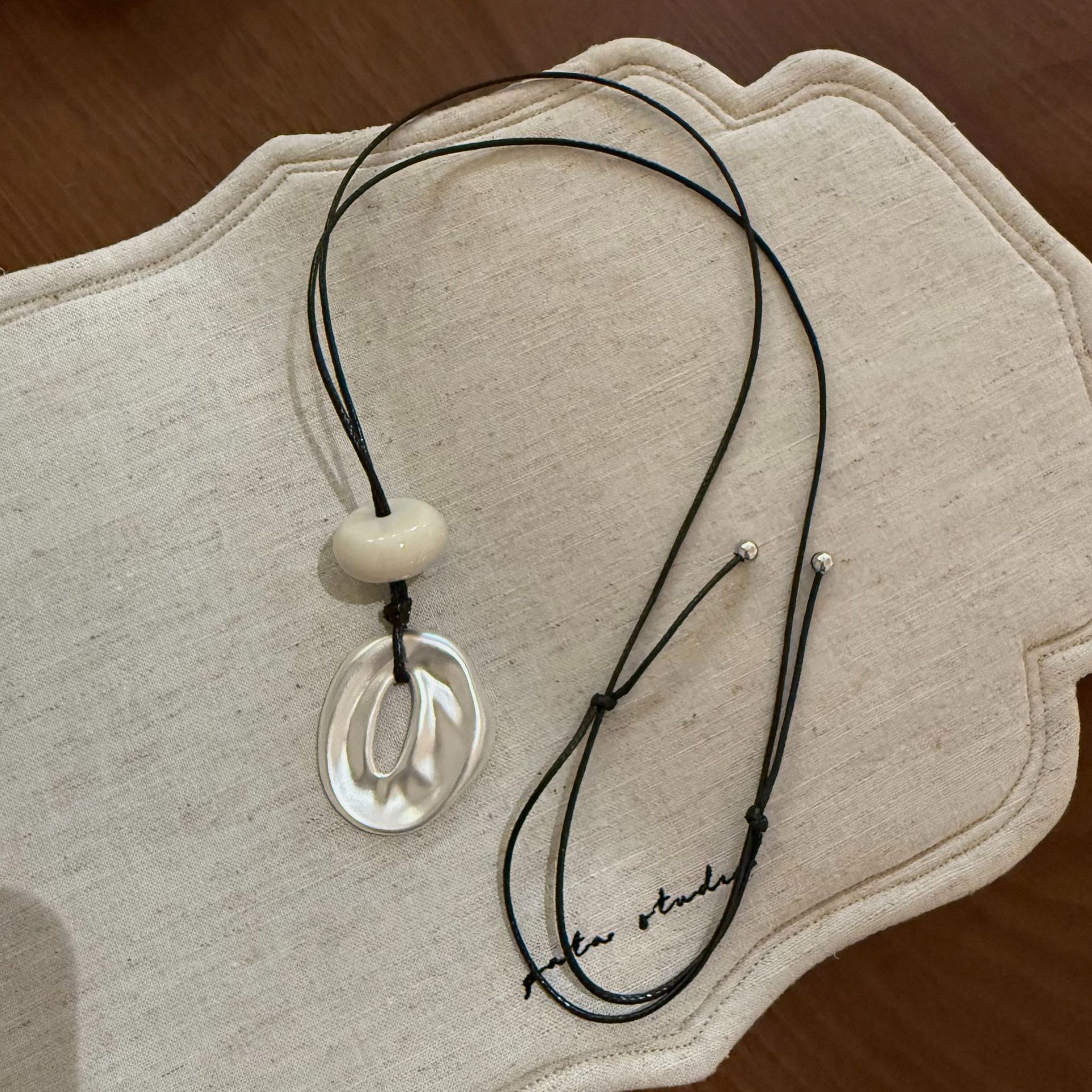 韓国の博主はチタン鋼豹紋樹脂の個性的な幾何学的デザイン感のあるセーターチェーンのロングタイプの黒紐ネックレスを組み合わせています。