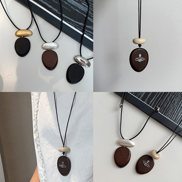 黑檀木烧银色爱心皮绳项链小众高级感设计锁骨链土星气质百搭项饰