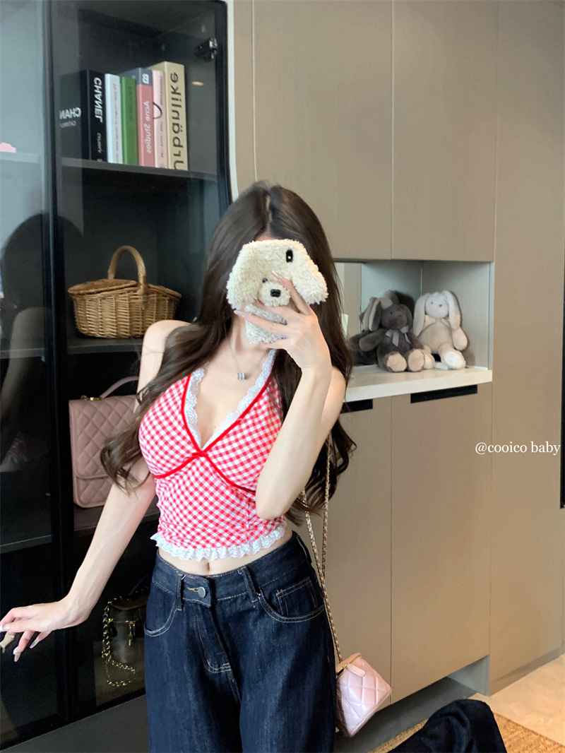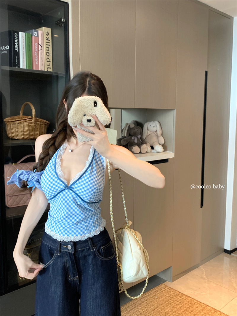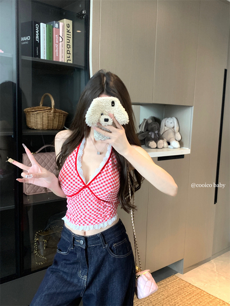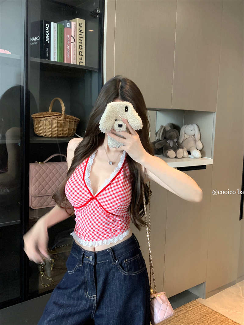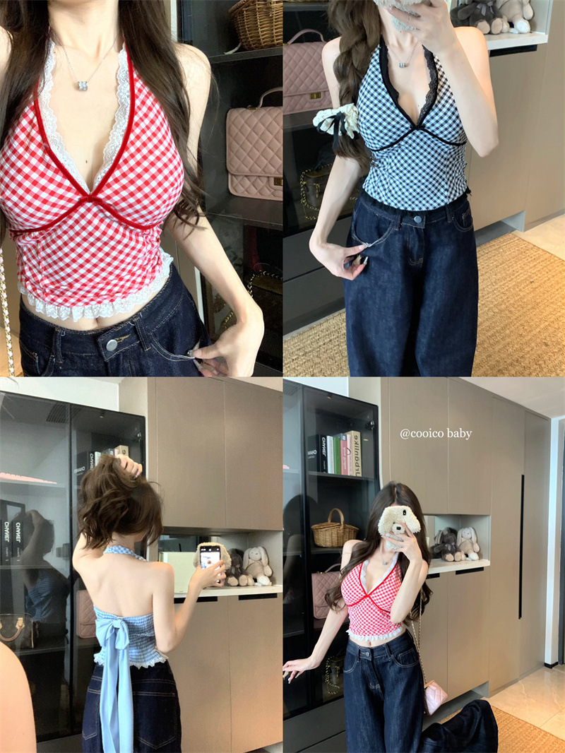 Chenling [オリジナル品質-リボン付き] ホットガールレースステッチホルターネックキャミソールレディースデザイン