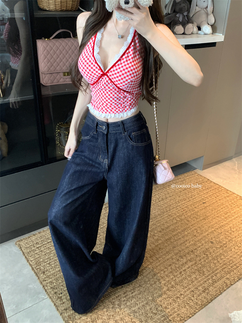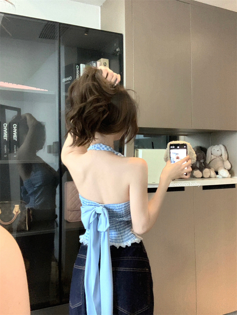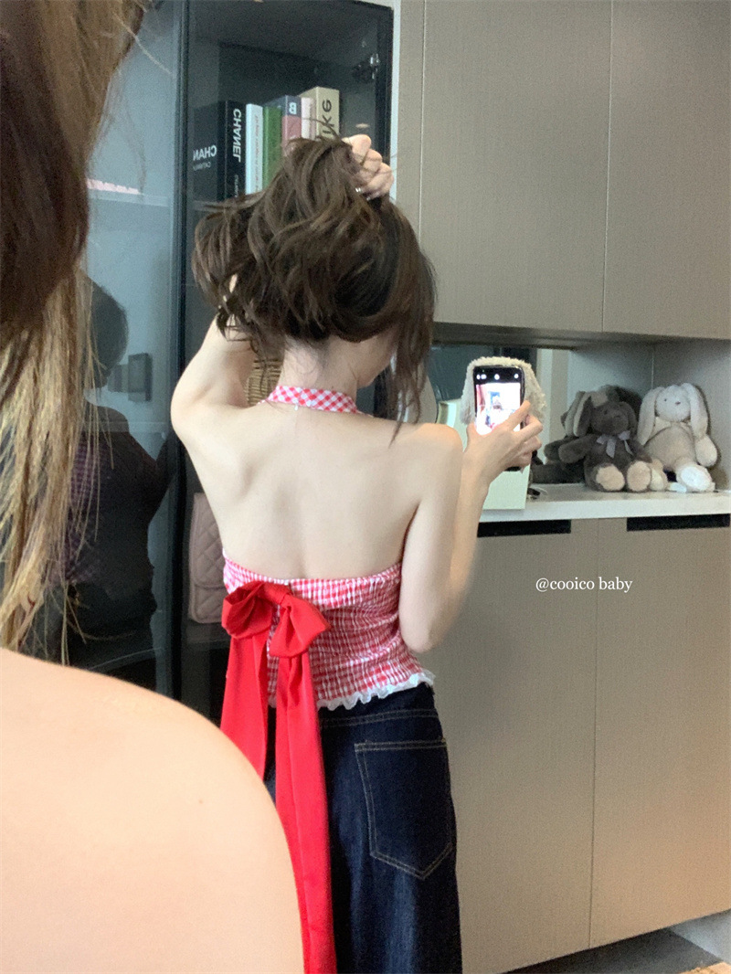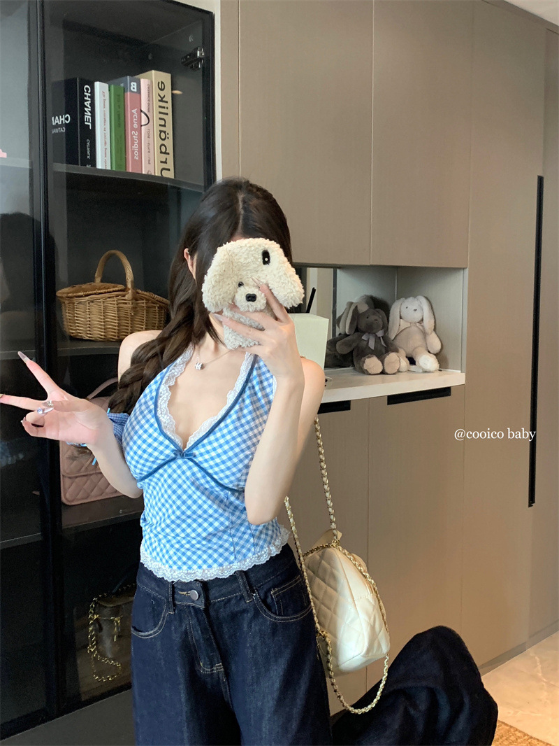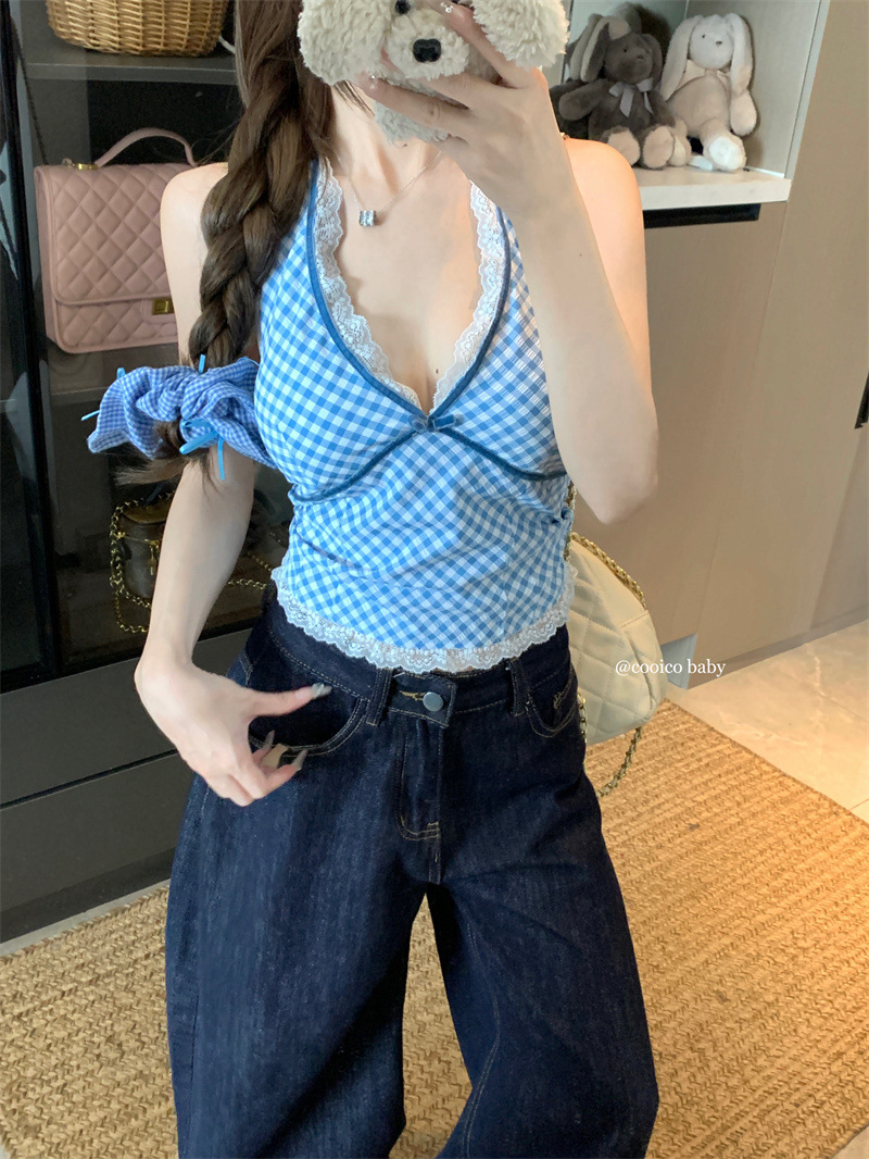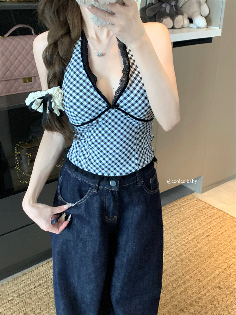 Chenling [オリジナル品質-リボン付き] ホットガールレースステッチホルターネックキャミソールレディースデザイン