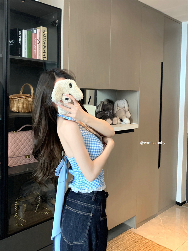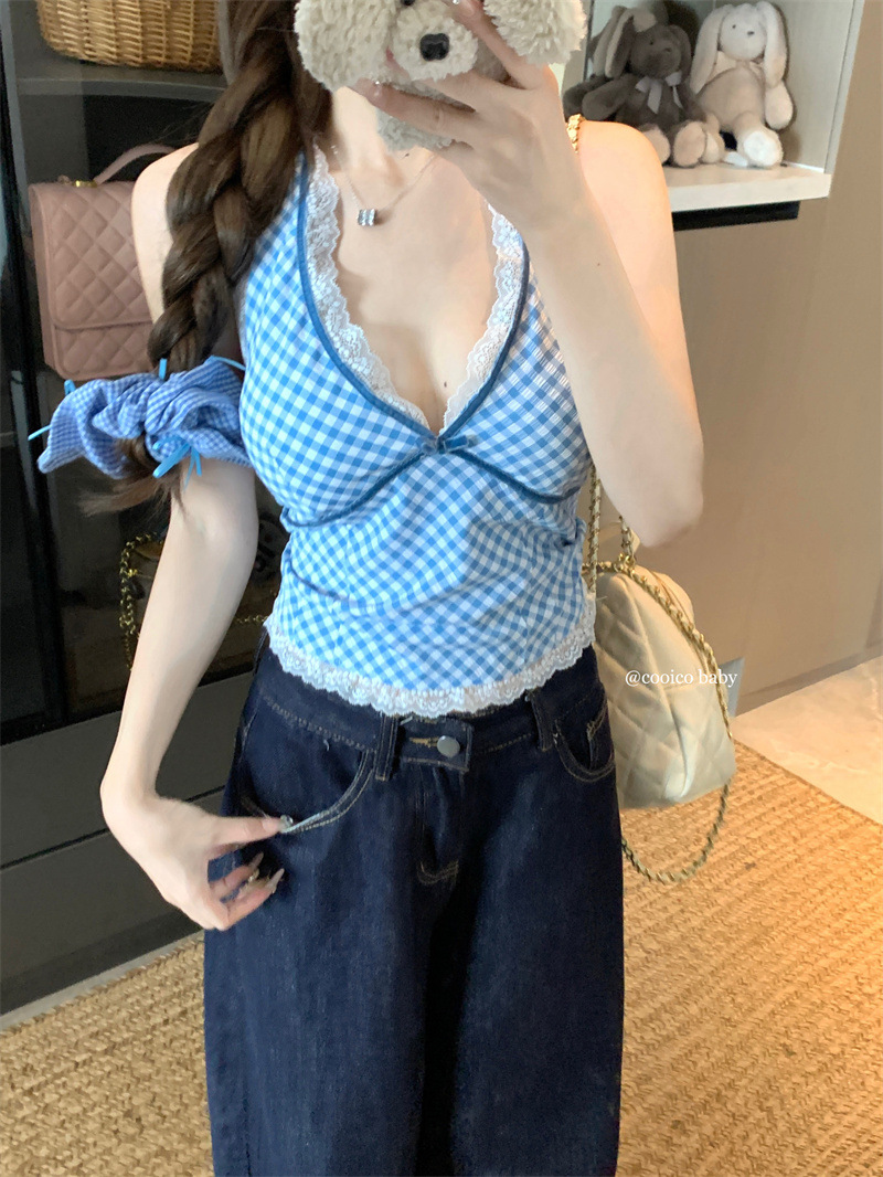朝襟【オリジナル品質-リボン付き】デザイン感ベストのストラップ女性夏はレースのギャルをつなぎ合わせます。