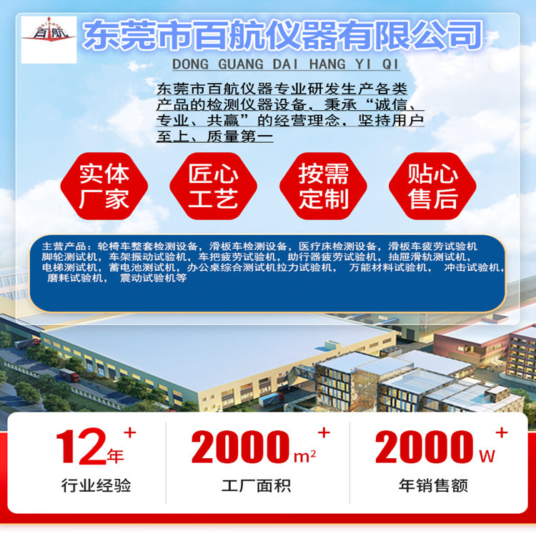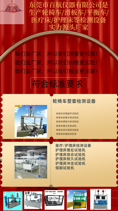 东莞市百航仪器有限公司厂家做为生产轮椅车试验检测仪器设备的厂家在广东、浙江、江苏、上海、山东、四川、北京及广东各市等全国各地已有一批客户在使用,每次生产前都会与客户仔细确认技术参数,并根据客户的实际使用过程中提出的建议不断改良产品,来实现操作更简单,试验更快捷,测试更,更方便,请来电咨询我们。