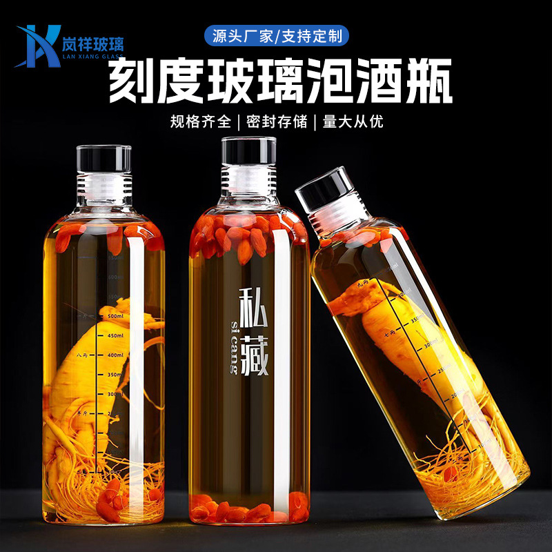 卸売透明ガラス酒ボトル空ボトルスケール高ホウケイ酸カップ蓋付き密封高麗人参と鹿の角ハイエンドワインボトル