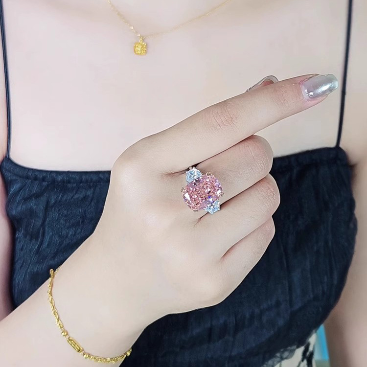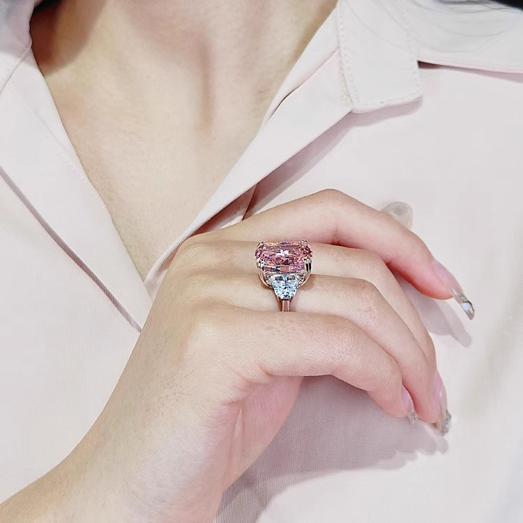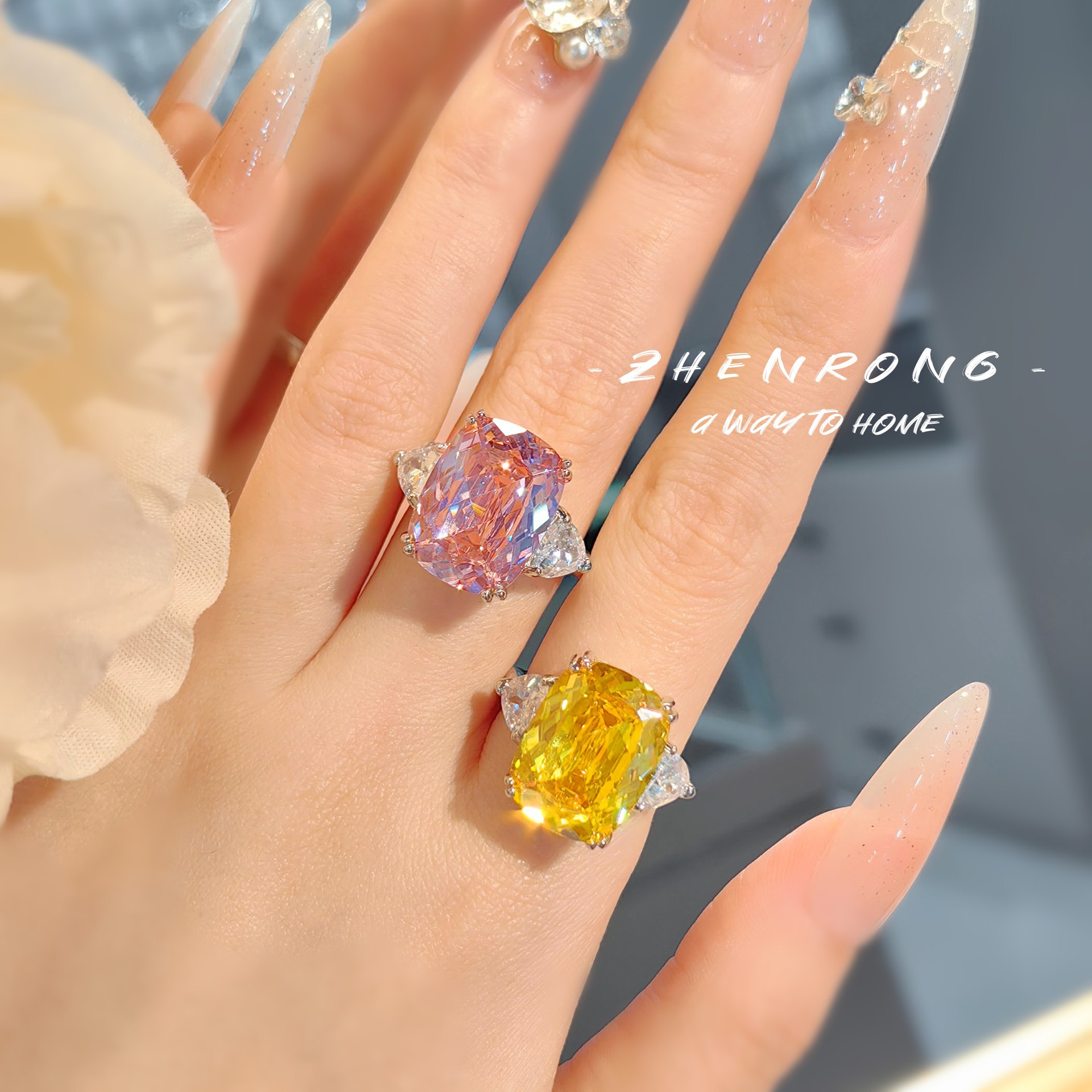 超きらら豪華ラディーン切長枕形のピンクのジルコンの指輪の女性のシンプルな気質の長方形の黄色のダイヤモンドの口の指輪の女性