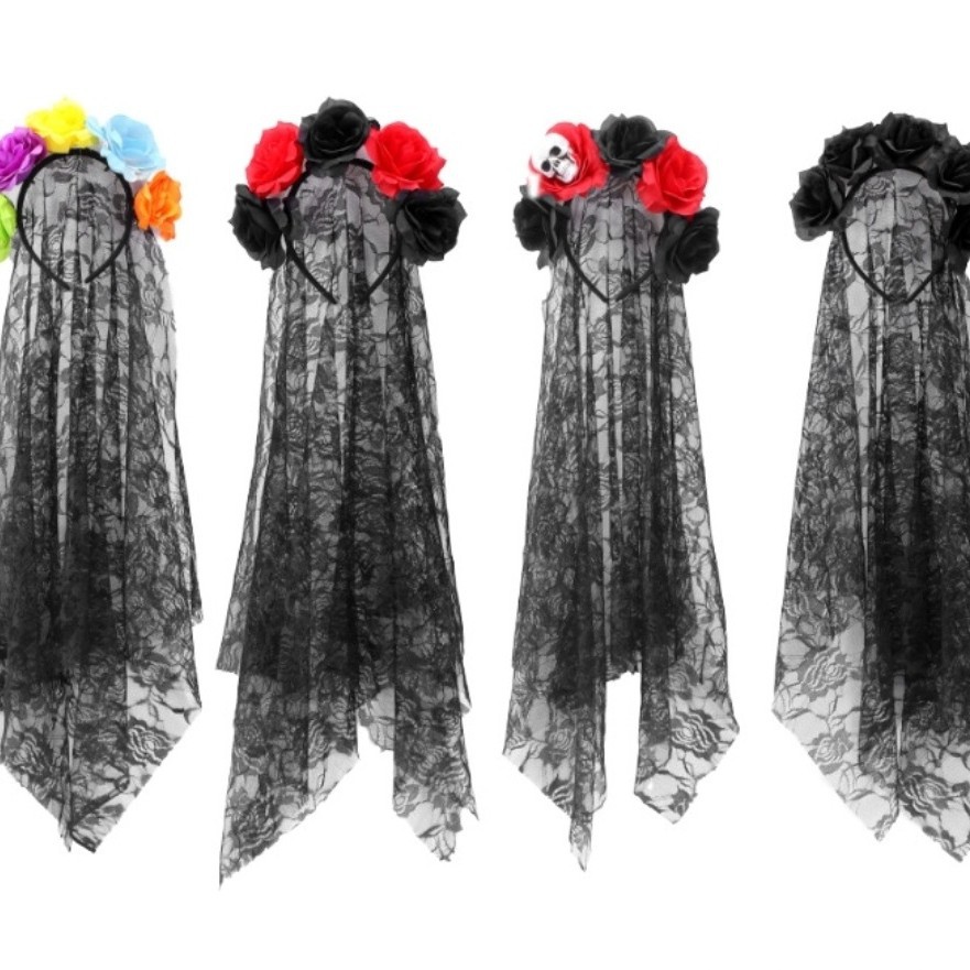 メキシコダークスタイル女性の花ベールヘアアクセサリーハロウィン模擬菊ヘッドバンド黒ガーゼショールヘッドバンド