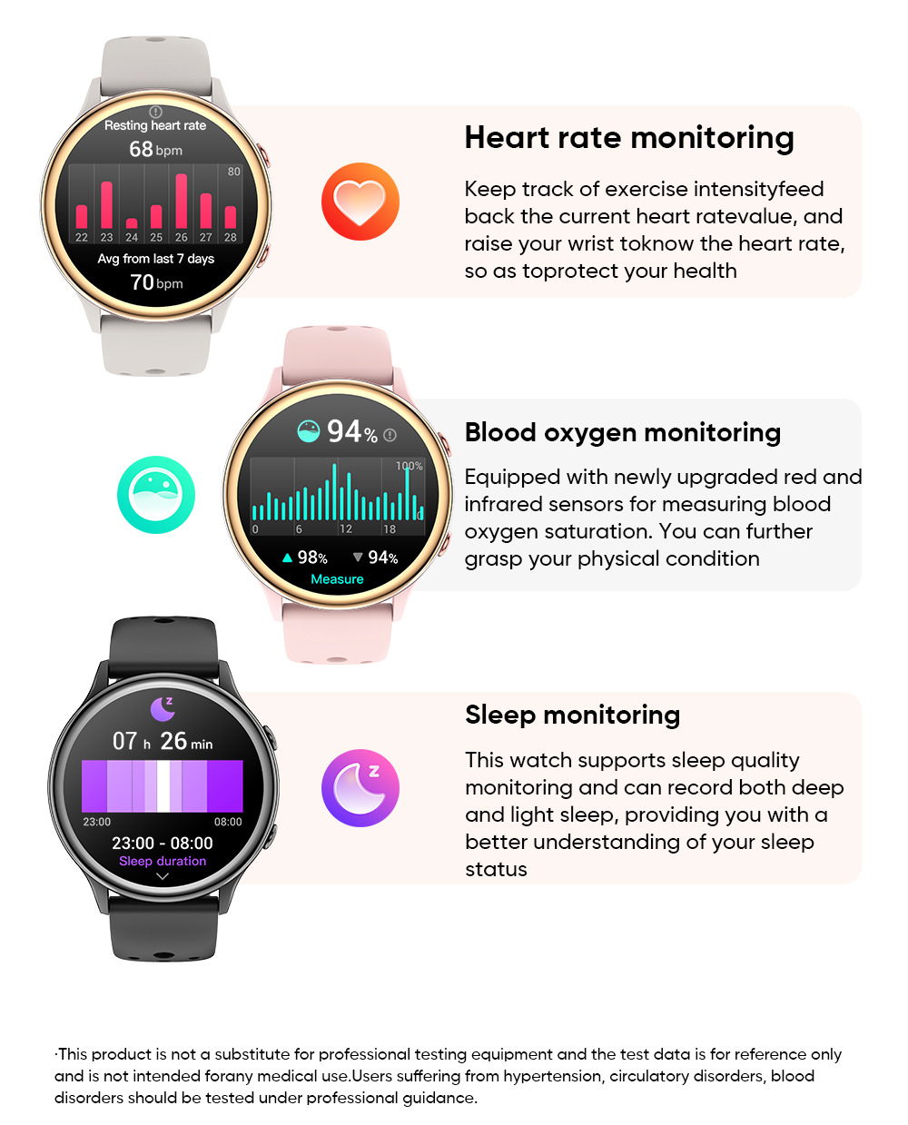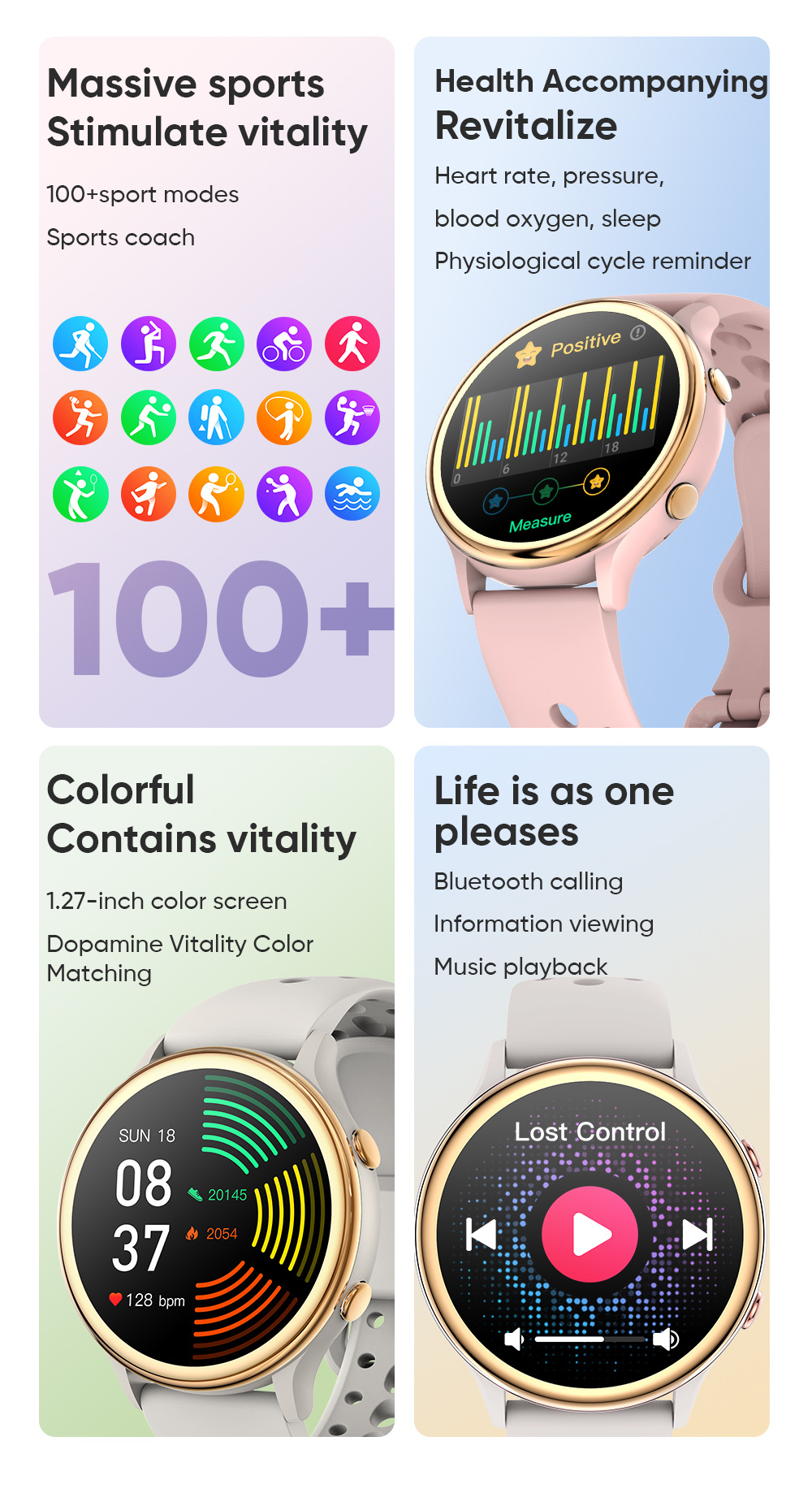 機能 防水,写真を撮る,歩数を数える,心拍数モニタリング,血圧測定,ソーシャルエンターテイメント,Bluetooth通話,スマートリマインダー,リモコン自撮り,睡眠モニタリング,血中酸素検査