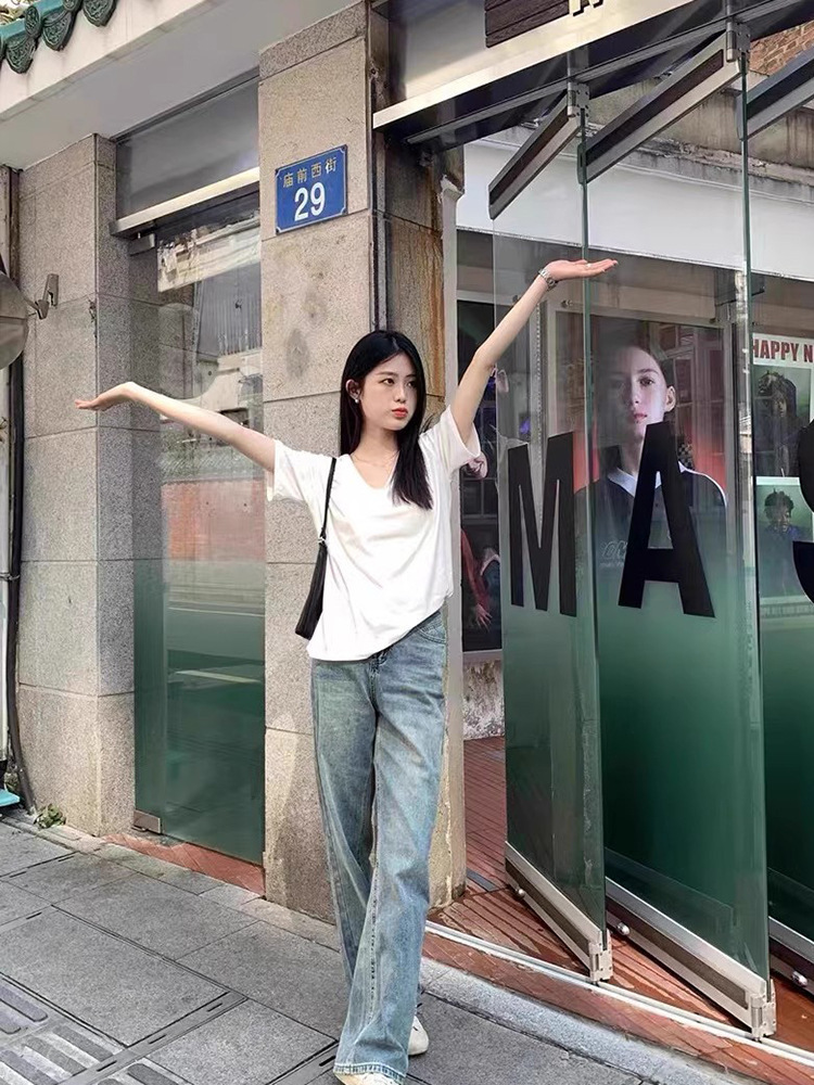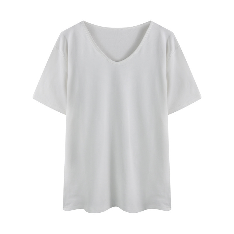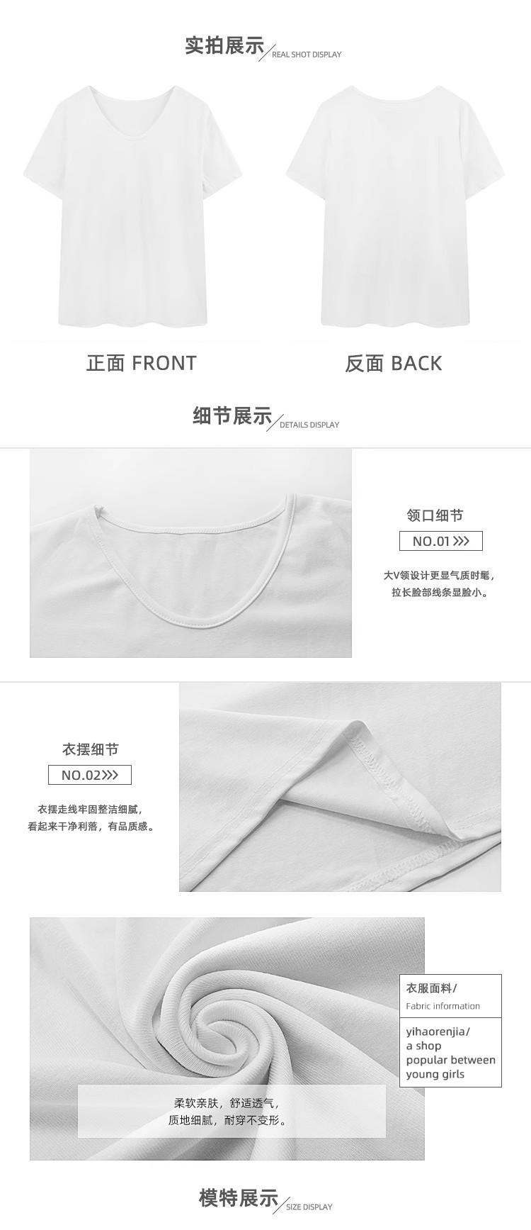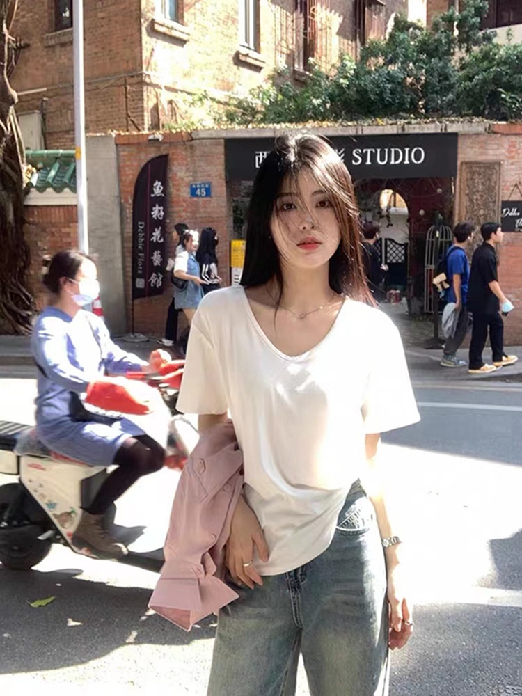 白いvネック半袖tシャツ女性夏2025新型ゆるい純色シャツの中にギャル学生上着が入っている