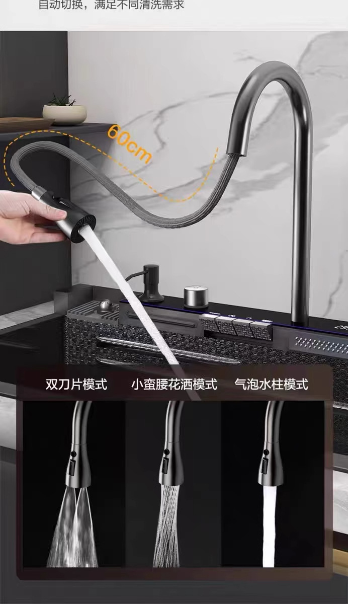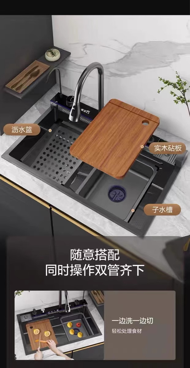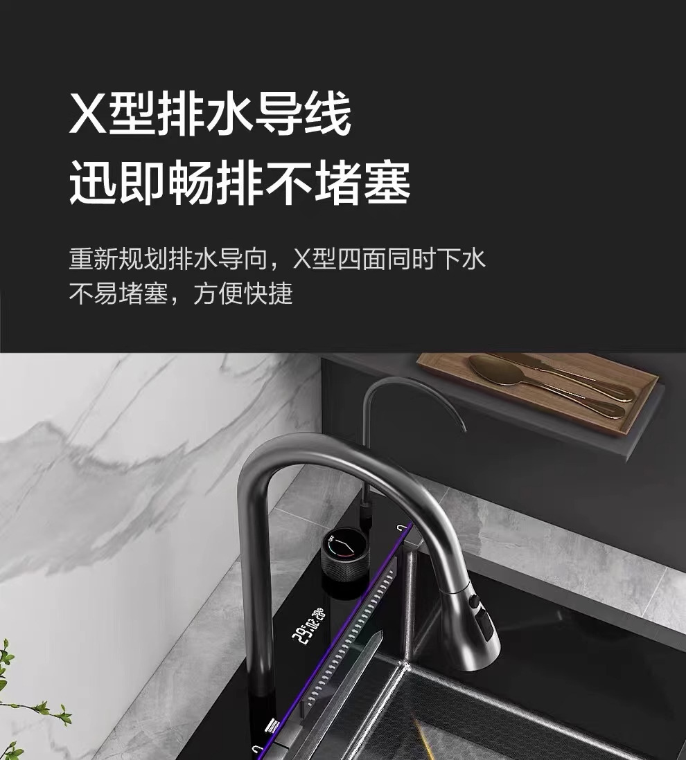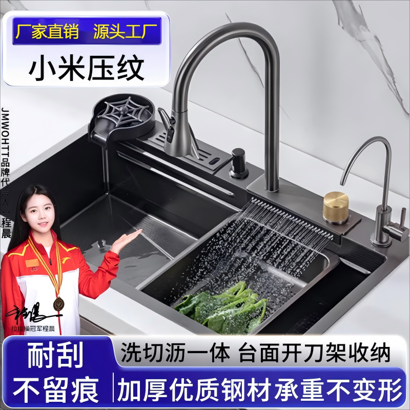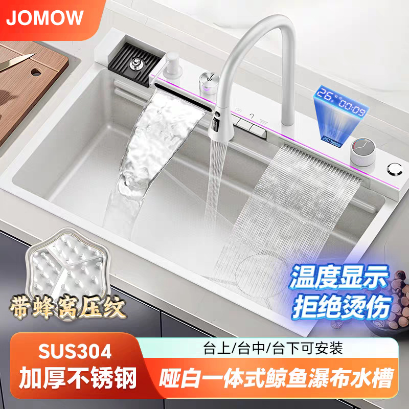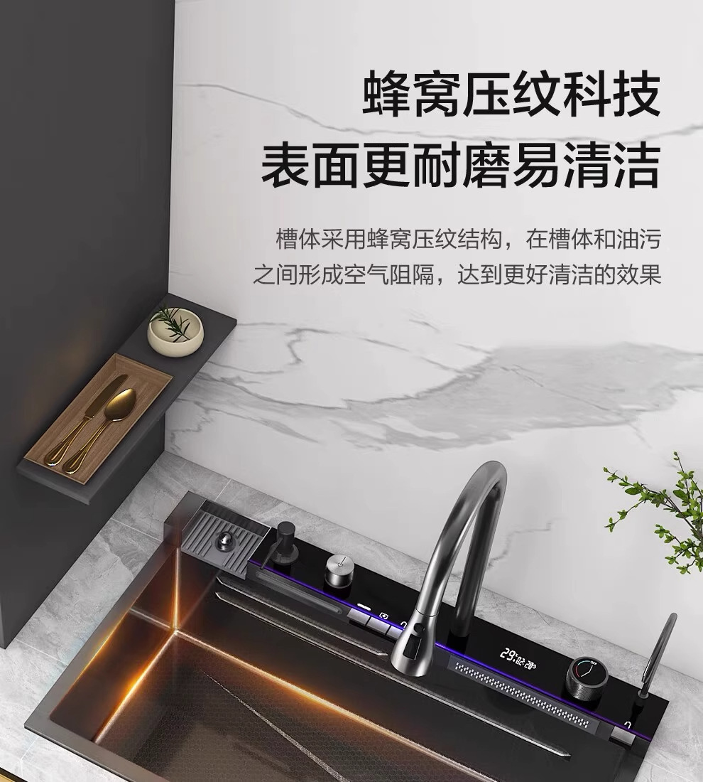 外贸鲸鱼钢琴数显飞雨瀑布水槽大单槽蜂窝纹304不锈钢厨房洗菜盆