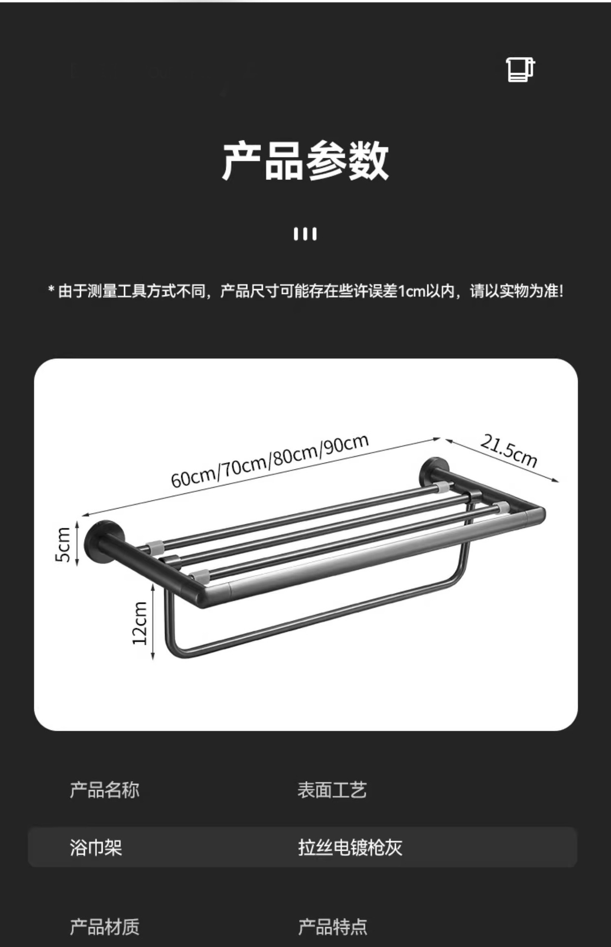 尺寸 【镀枪灰】60cm浴巾架-打孔款,【镀枪灰】60cm双杆-打孔款,【镀枪灰】60cm单杆-打孔款,【镀枪灰】单衣钩-打孔款,【镀枪灰】带钩纸巾架-打孔款,【镀枪灰】带钩毛巾环-打孔款,【镀枪灰】马桶刷-打孔款,【镀枪灰】60cm单杆-免钉款,【镀枪灰】单衣钩-免钉款,【镀枪灰】带钩纸巾架-免钉款,【镀枪灰】带钩毛巾环-免钉款,【镀铬】60cm浴巾架-打孔款,【镀铬】60cm双杆-打孔款,【镀铬】60cm单杆-打孔款,【镀铬】单衣钩-打孔款,【镀铬】带钩纸巾架-打孔款,【镀铬】带钩毛巾环-打孔款,【镀铬】马桶刷-打孔款,【镀铬】60cm单杆-免钉款,【镀铬】单衣钩-免钉款,【镀铬】带钩纸巾架-免钉款,【镀铬】带钩毛巾环-免钉款