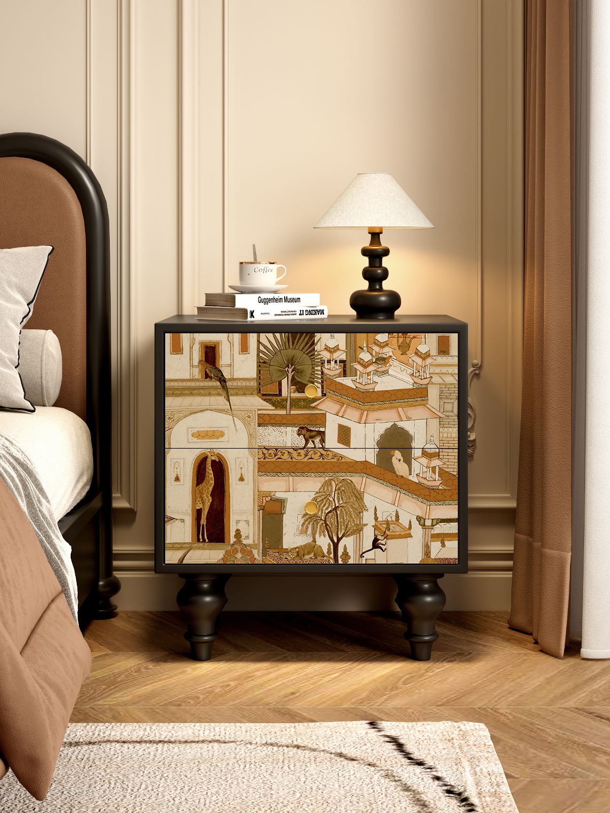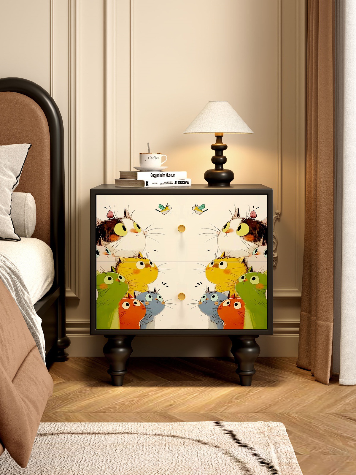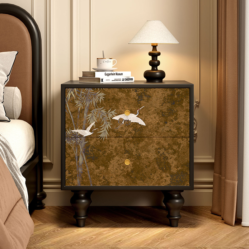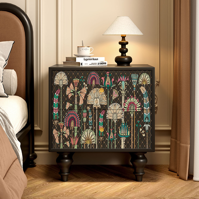 無垢材フレンチレトロ引き出しキャビネット抽象アート収納キャビネット寝室のベッドサイドテーブルリビングルームサイドキャビネット引き出しキャビネット収納キャビネット