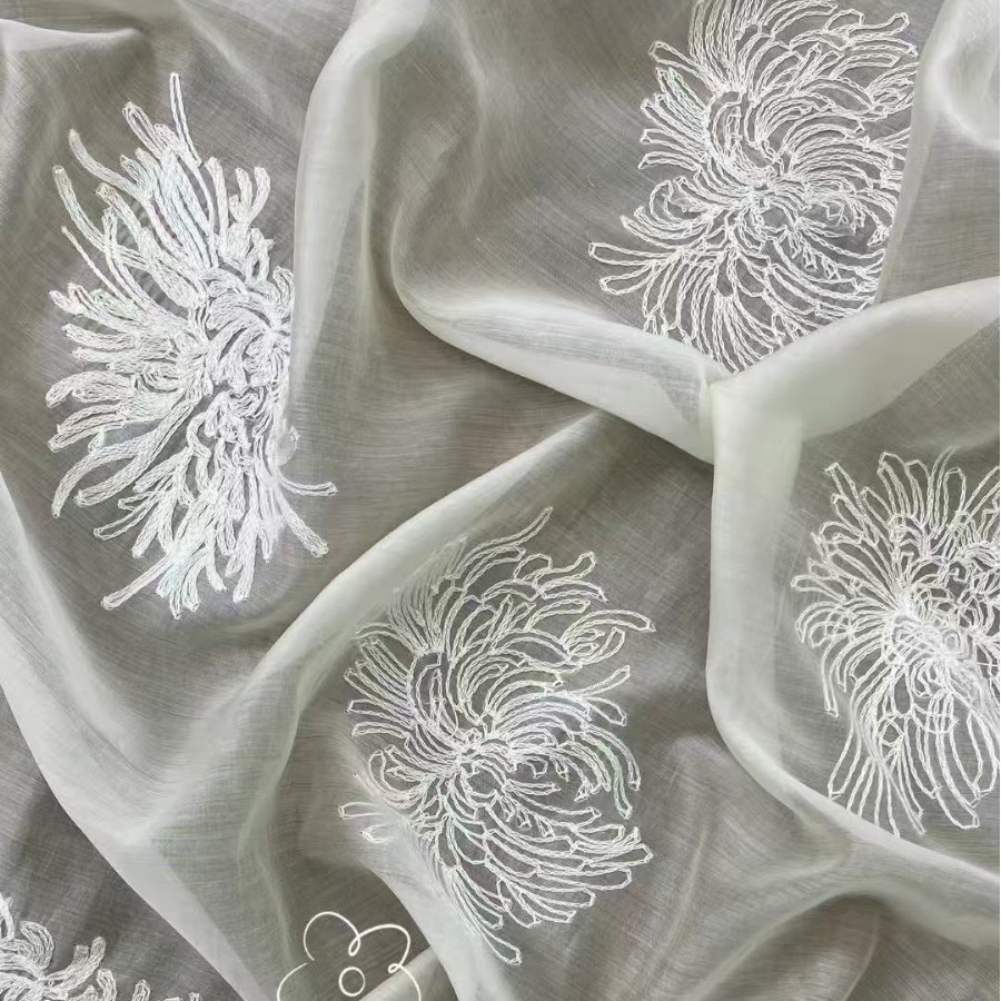 夏季新款扬州纱古风汉服真丝白金花绣花布料 厂家直销立体绣