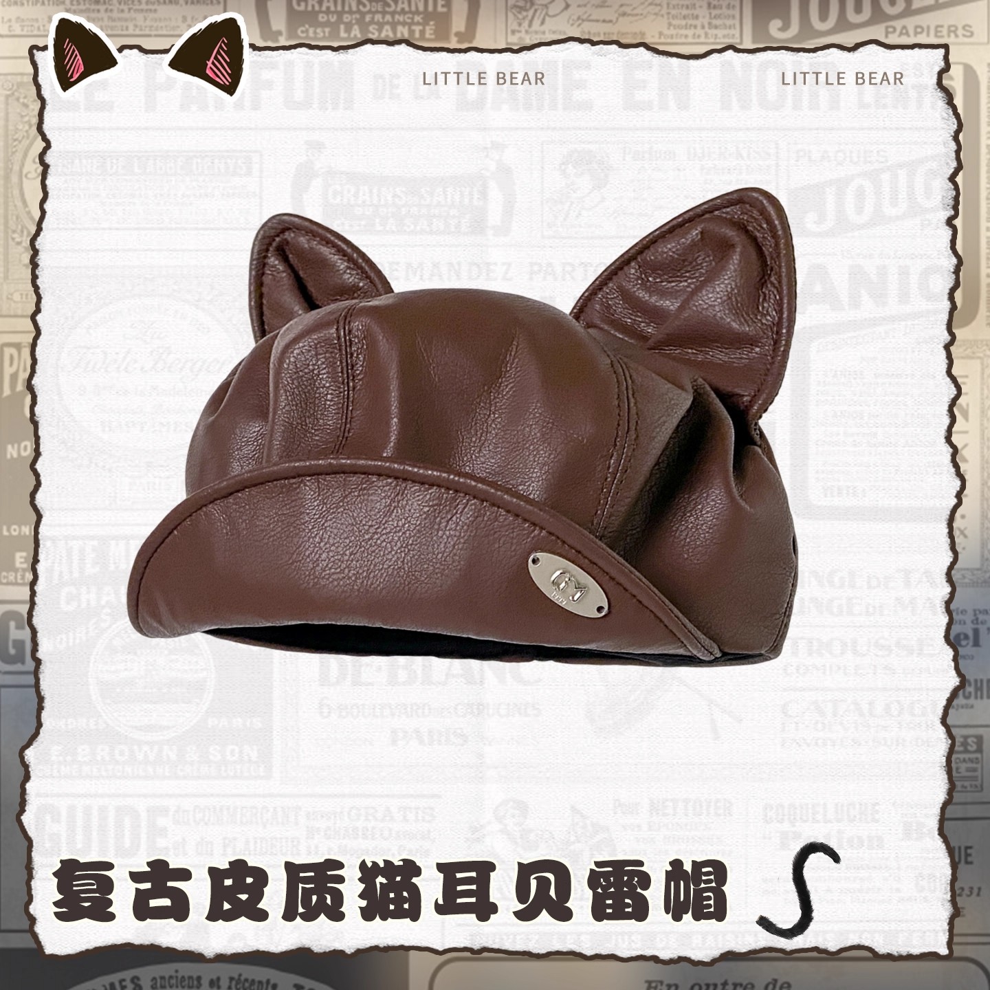 pu皮质可爱猫耳朵贝雷帽女春秋显脸小黑色八角帽复古报童画家帽子