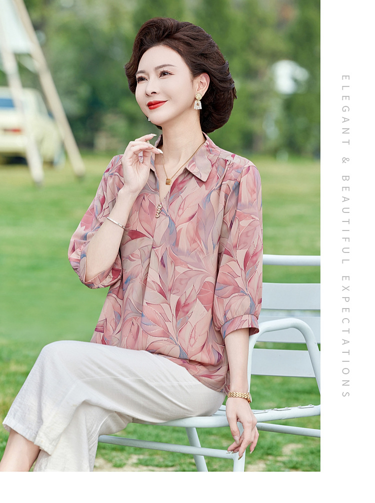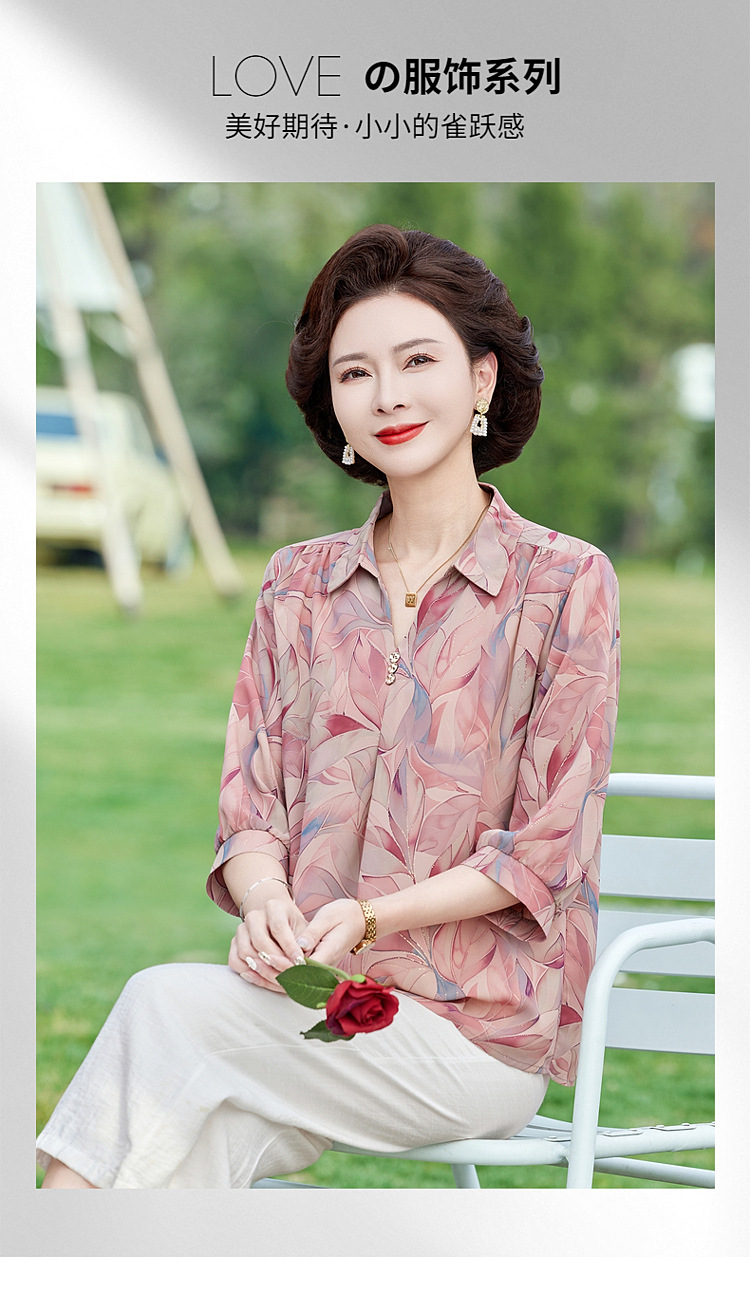 ママ服夏七分袖Tシャツレディース薄手おしゃれママラペルシャツ高齢者服リッチレディトップス
