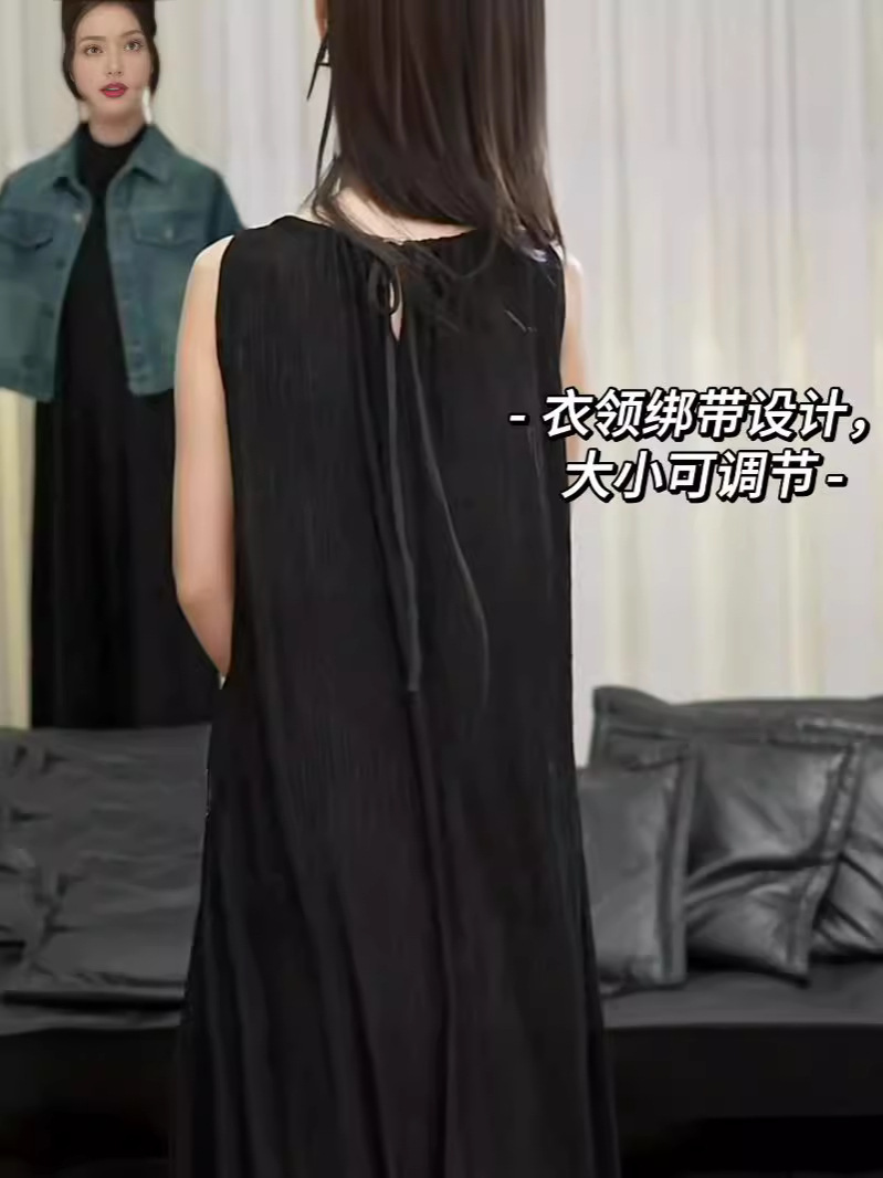 2025新款法式气质黑色连衣裙褶皱小众设计感薄款绑带收腰背心长裙