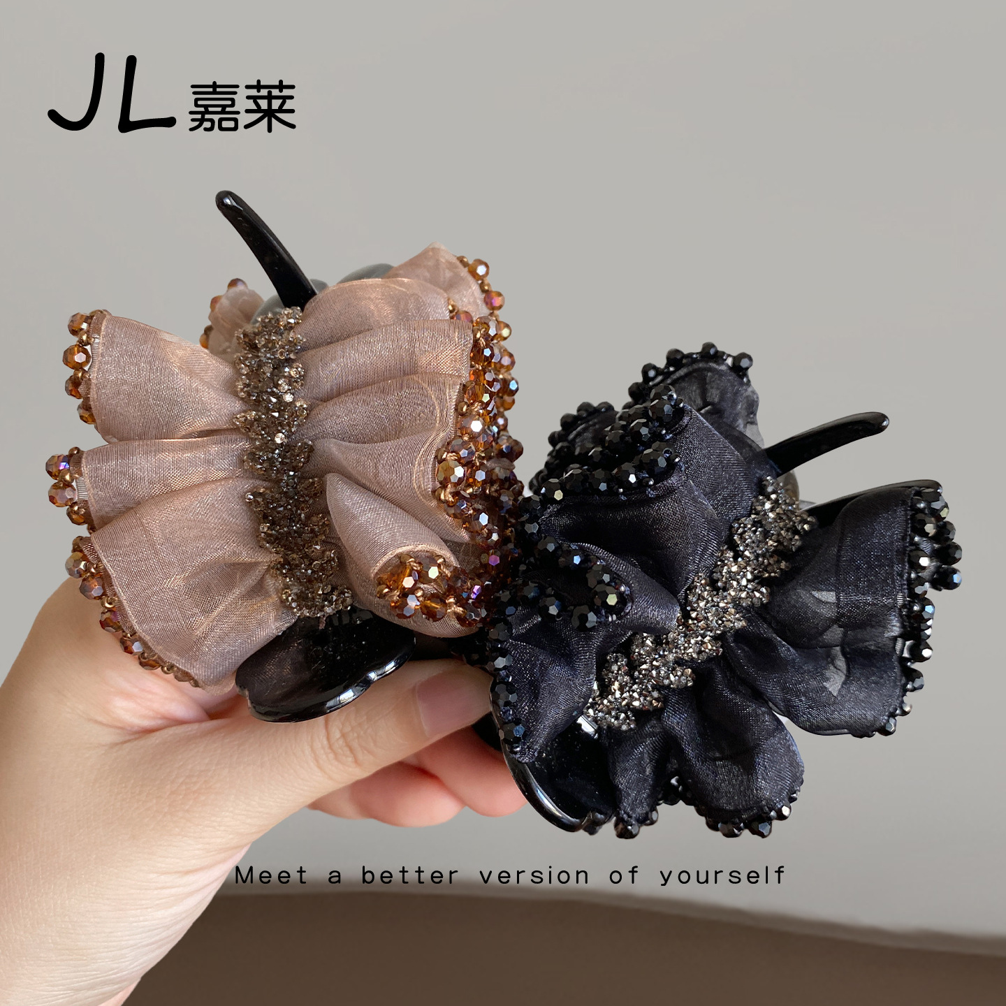 立体フラワーラインストーングリッパー - ピンクとパープル,立体フラワーラインストーングリッパー-ブラック