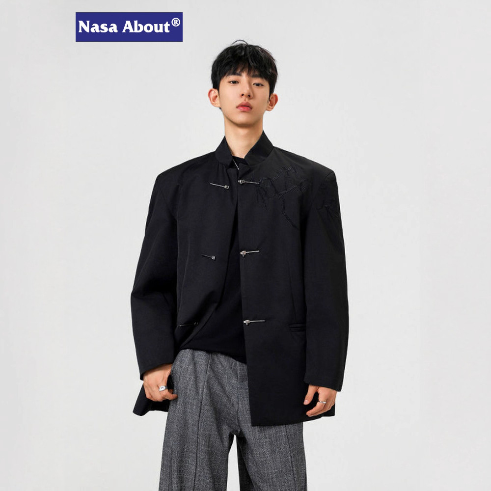 NASA新中式刺绣立领小西服外套加肥大码宽松潮牌通勤风穿搭中山装
