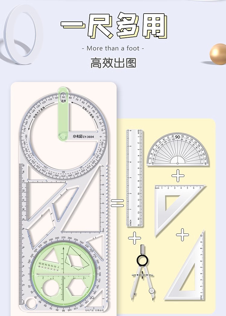 多功能尺子小学生专用初中生几何图形绘画尺三角尺套装制绘图格尺