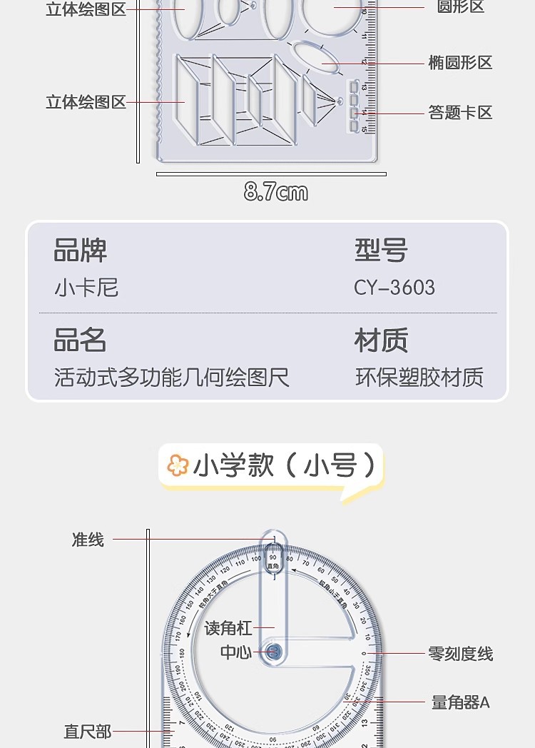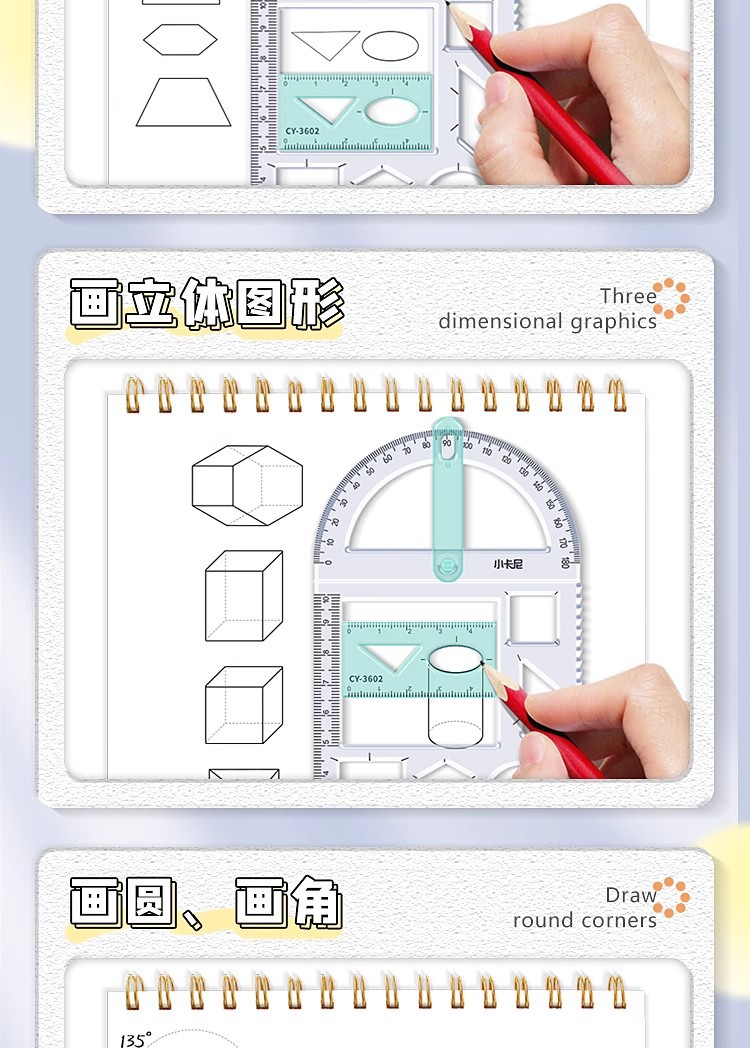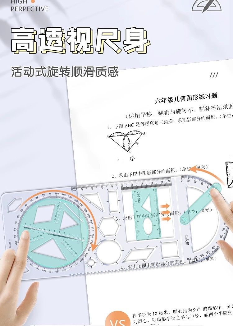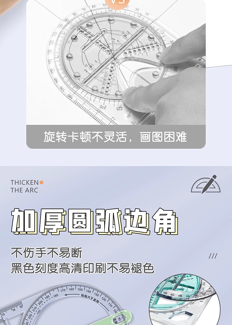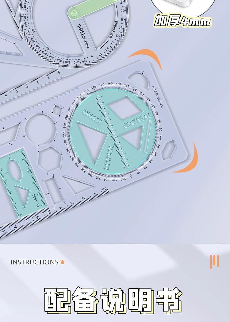 小学生向け多機能幾何学描画定規、立体図形定規、分度器、角度を回転させることができる、厚みのある