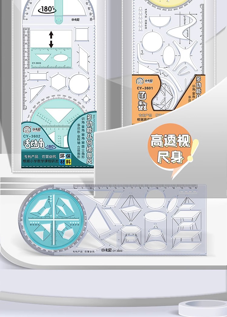 3601【高校風幾何学描画定規】,3602【小学生向け幾何学描画定規】,3603【中・高校用幾何学描画定規】,3604 【中学生向け可動角幾何定規】,3306【可動角幾何学描画定規】,3307【可動幾何学描画定規】,3308【サイ関数幾何学描画定規】,3607丨8本セット【機能定規】,3608丨8本セット【幾何定規】